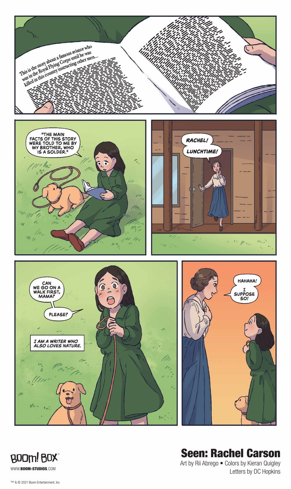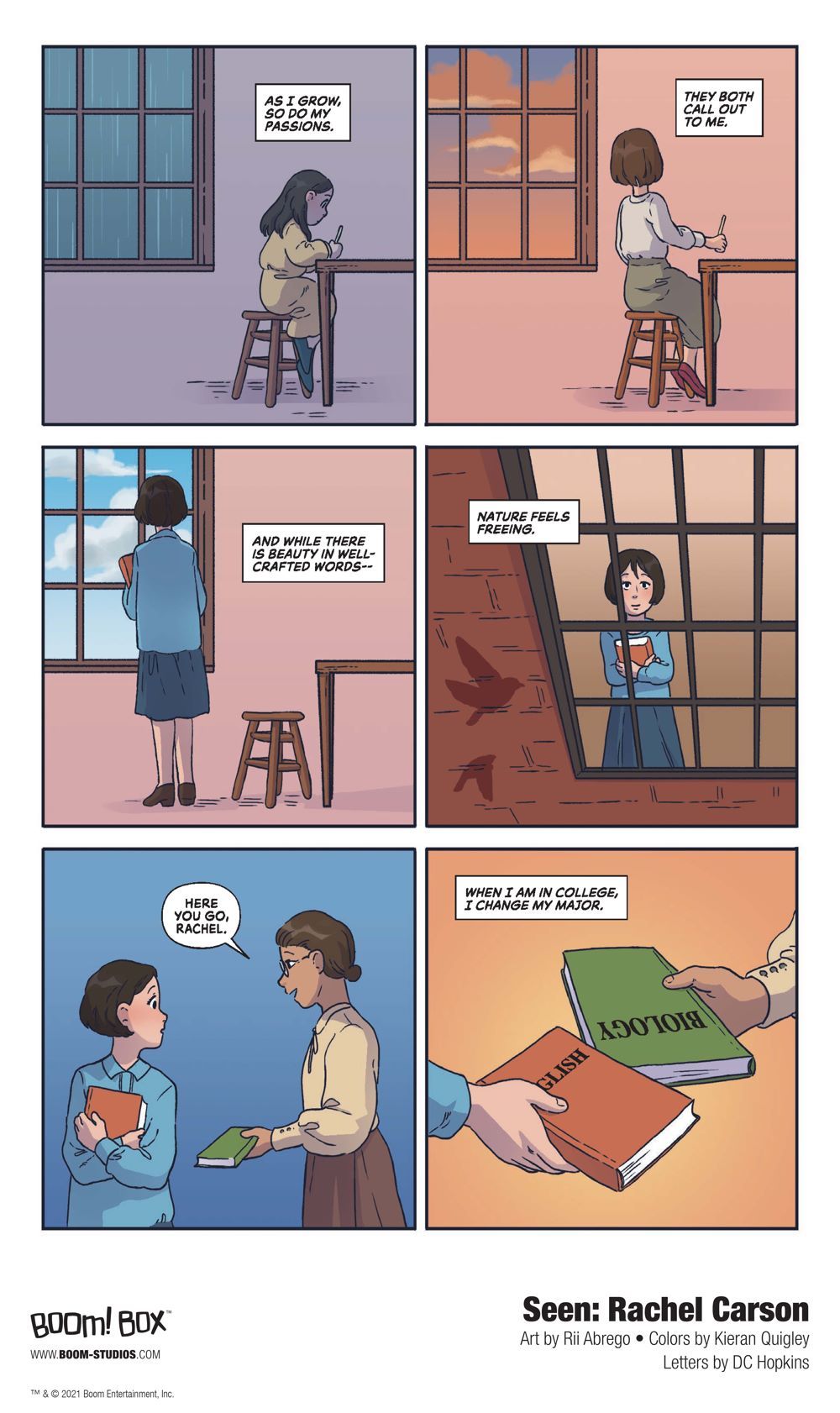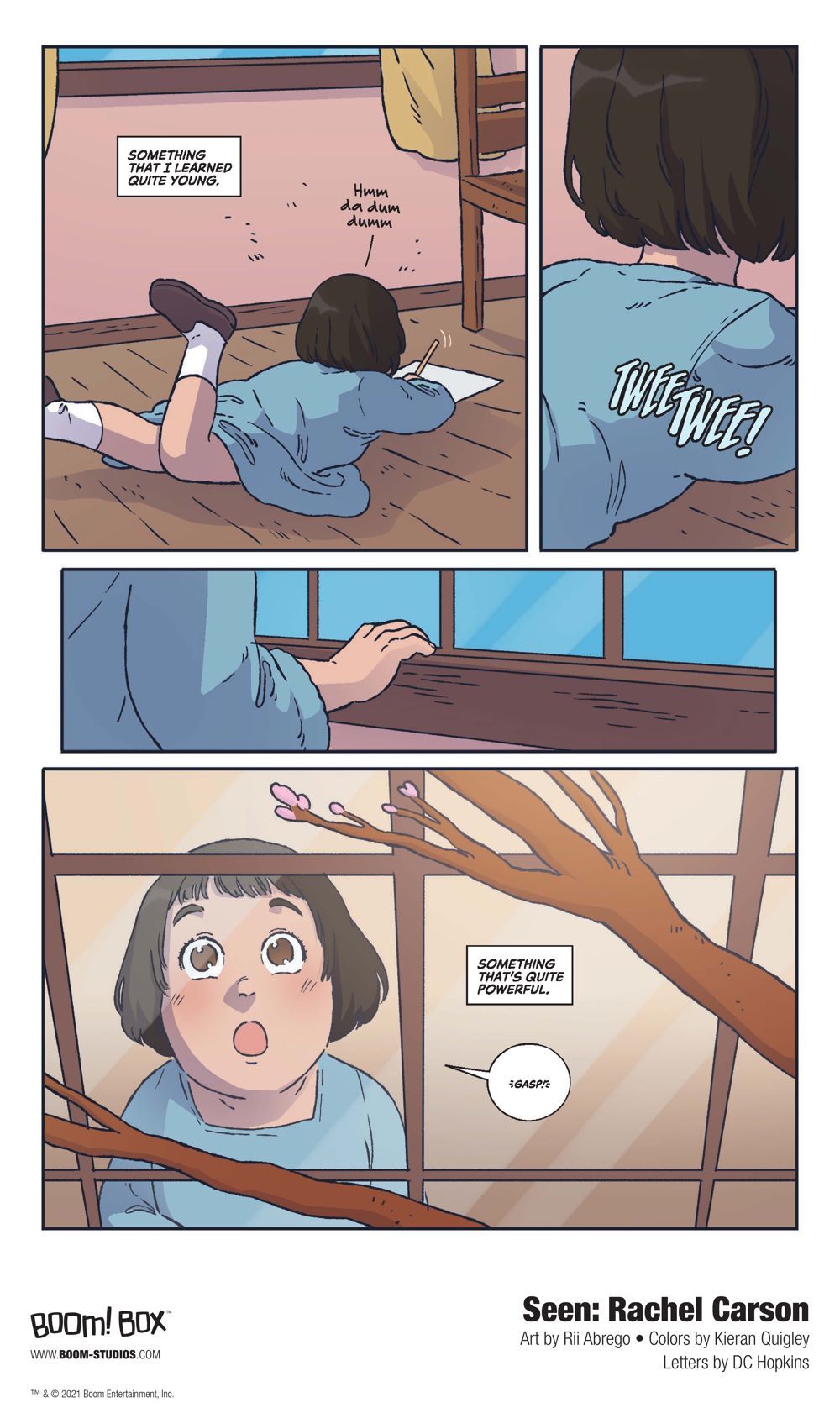 Media Release -- BOOM! Studios revealed today a first look at SEEN: RACHEL CARSON, a brand new original graphic novel from writer Birdie Willis (Over the Garden Wall) and artist Rii Abrego (Steven Universe) in the SEEN: TRUE STORIES OF MARGINALIZED TRAILBLAZERS series illuminating the triumphs and struggles of important historical figures who aren't found in traditional textbooks, but deserve to be remembered for their contributions to humanity and their inarguable strength and courage in the face of impossible odds. They're the heroes— the inventors, the artists, the activists, and more—whose stories you won't want to miss.