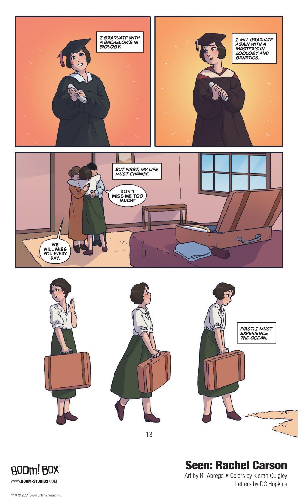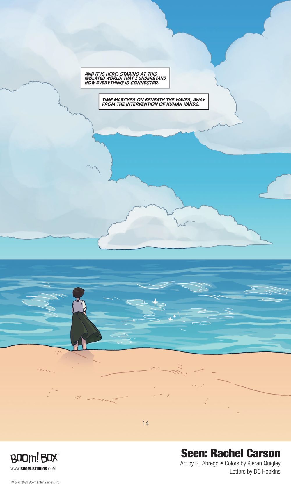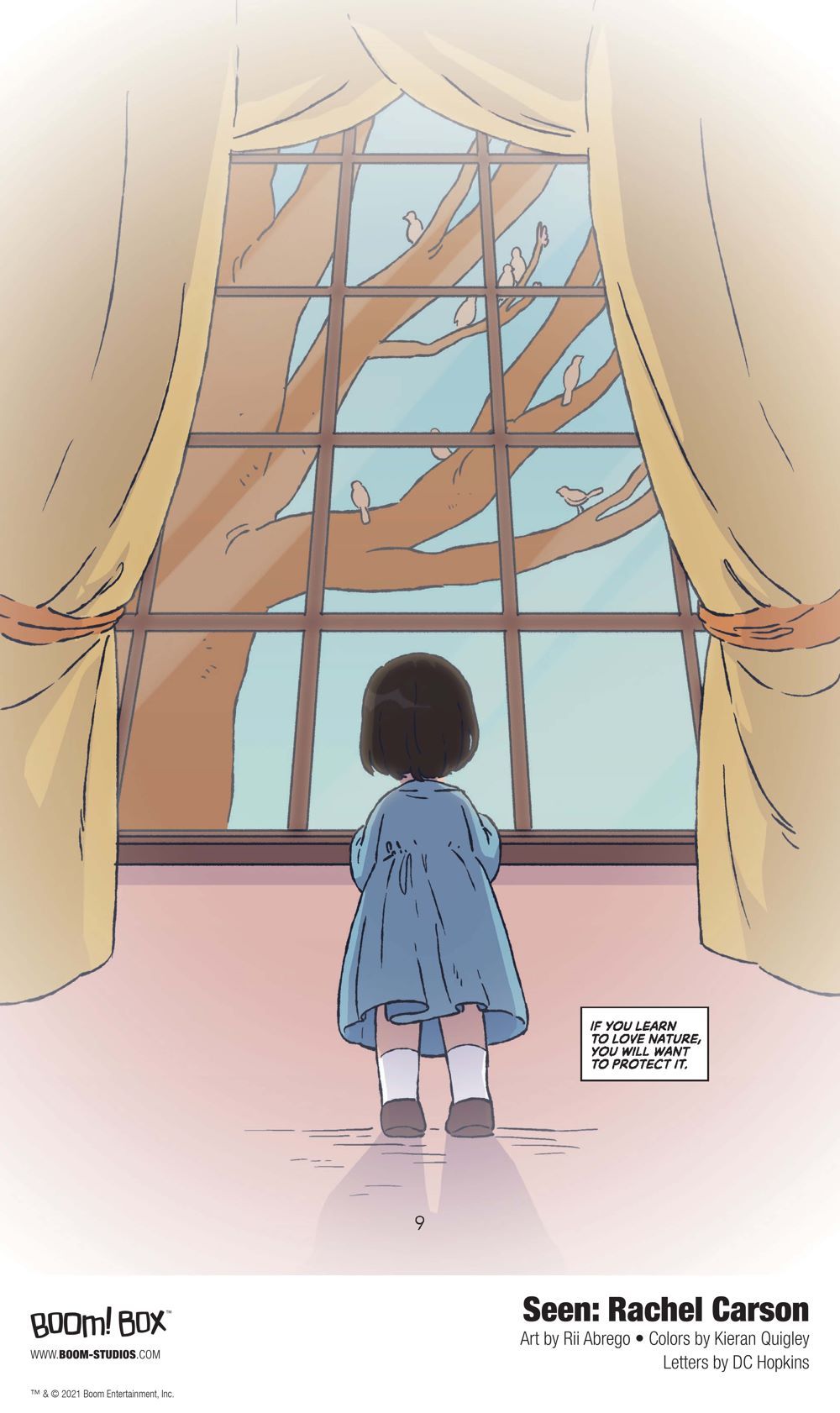 Media Release -- BOOM! Studios revealed today a first look at SEEN: RACHEL CARSON, a brand new original graphic novel from writer Birdie Willis (Over the Garden Wall) and artist Rii Abrego (Steven Universe) in the SEEN: TRUE STORIES OF MARGINALIZED TRAILBLAZERS series illuminating the triumphs and struggles of important historical figures who aren't found in traditional textbooks, but deserve to be remembered for their contributions to humanity and their inarguable strength and courage in the face of impossible odds. They're the heroes— the inventors, the artists, the activists, and more—whose stories you won't want to miss.