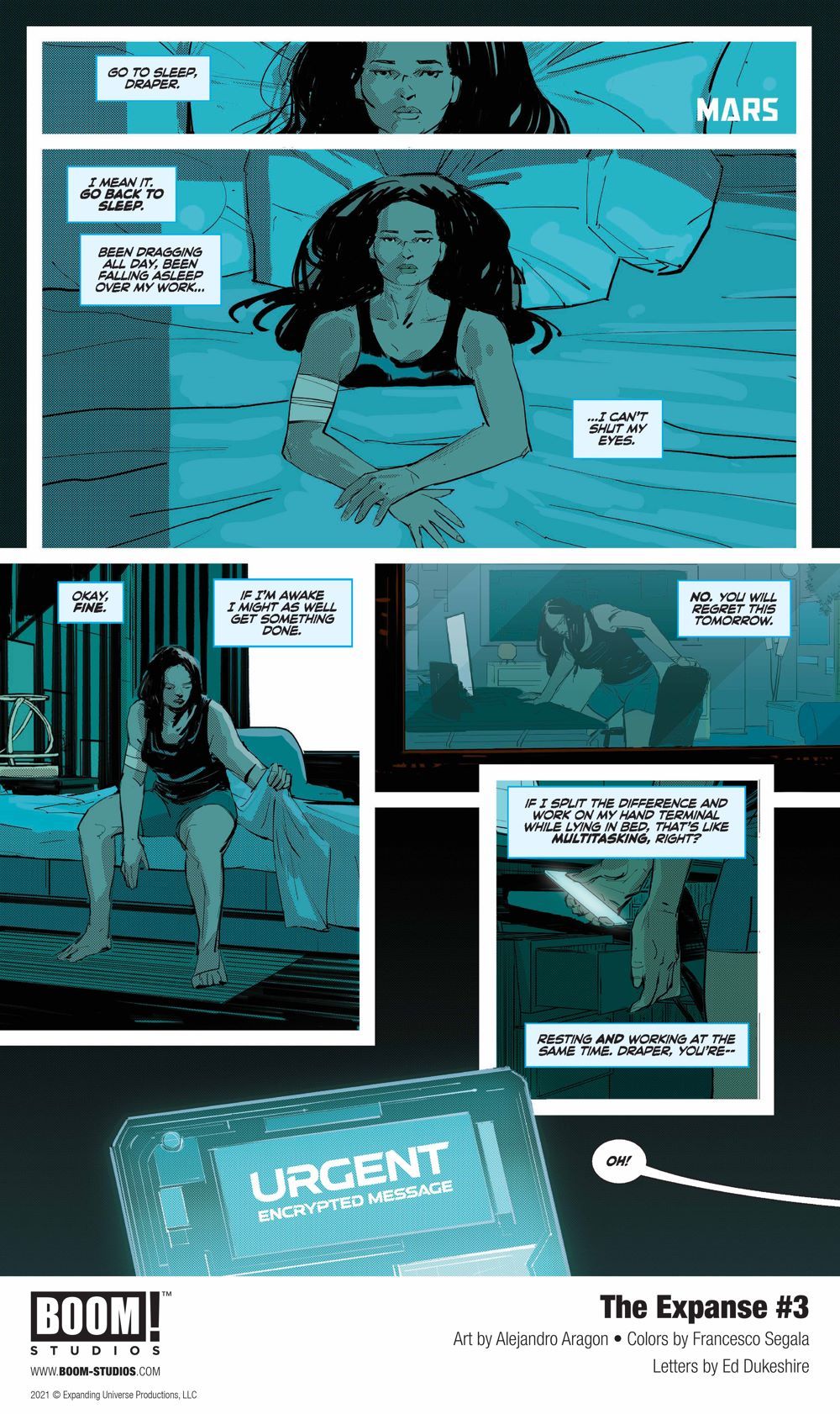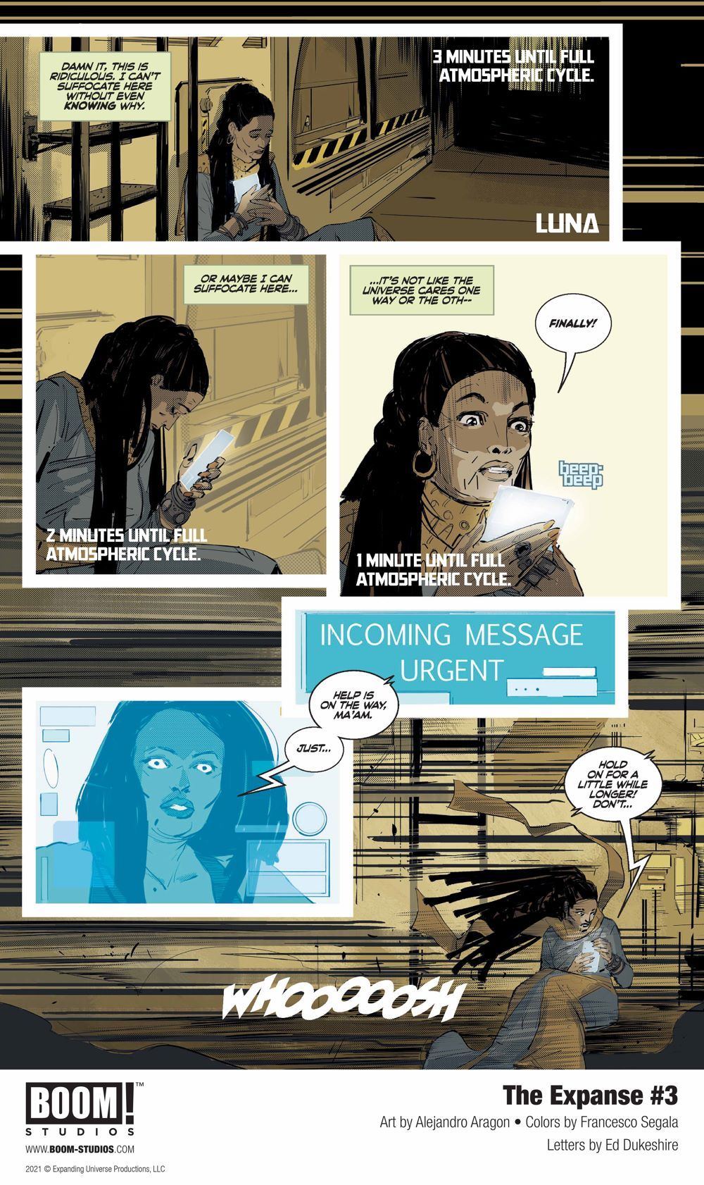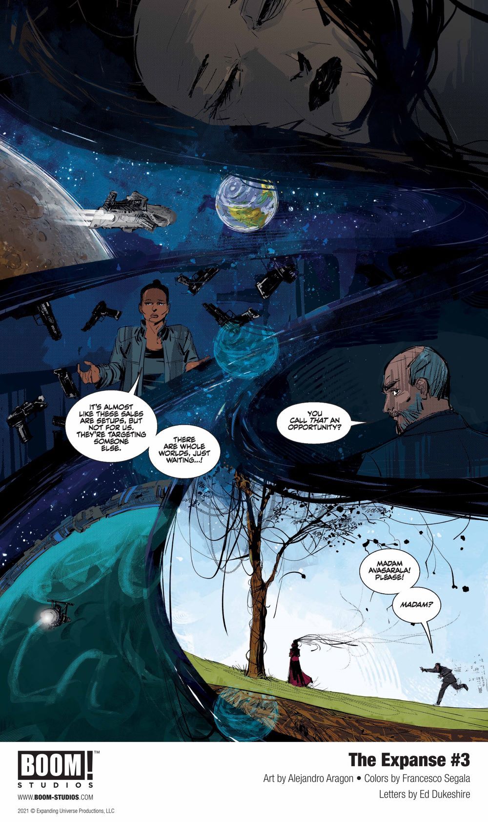Media Release -- BOOM! Studios revealed today a first look at THE EXPANSE #3, the latest issue of the four-issue limited comic book series from writer Corinna Bechko (Green Lantern: Earth One), artist Alejandro Aragon (Resonant), colorist Francesco Segala (Firefly) and letterer Ed Dukeshire (Once & Future), which is set between Season 4 and the fifth season of the Amazon Prime Video hit television series, The Expanse, available in comic shops February 17, 2021.