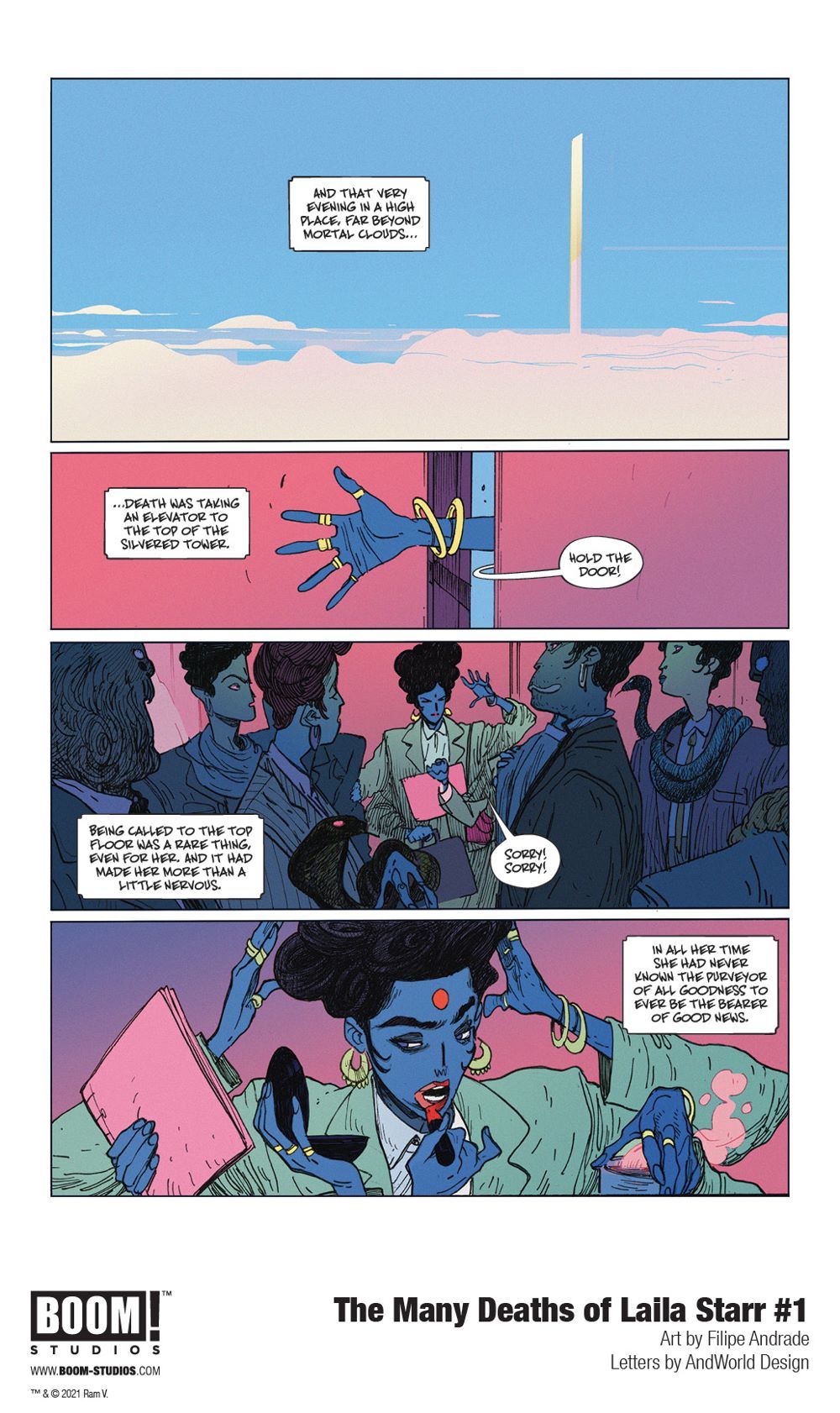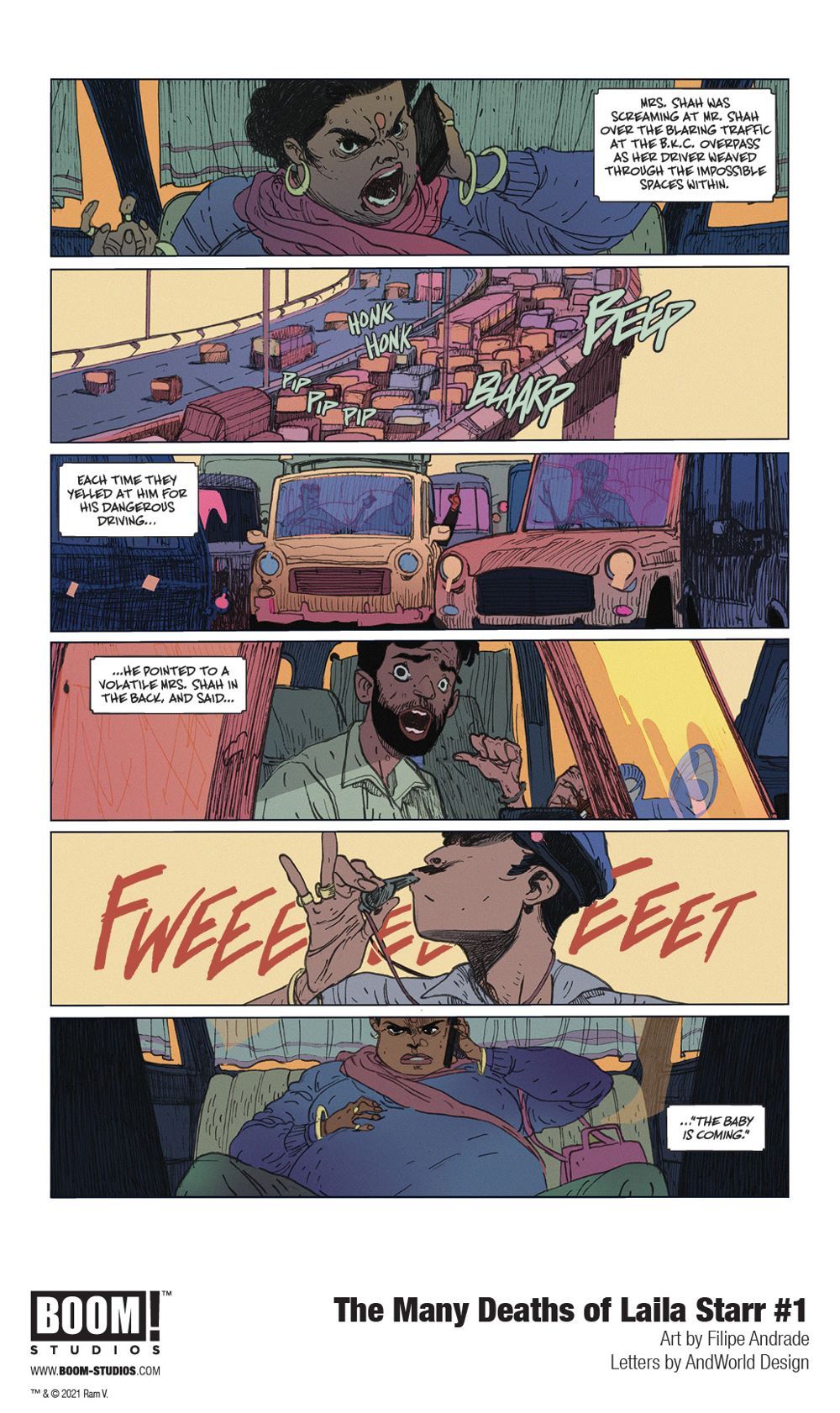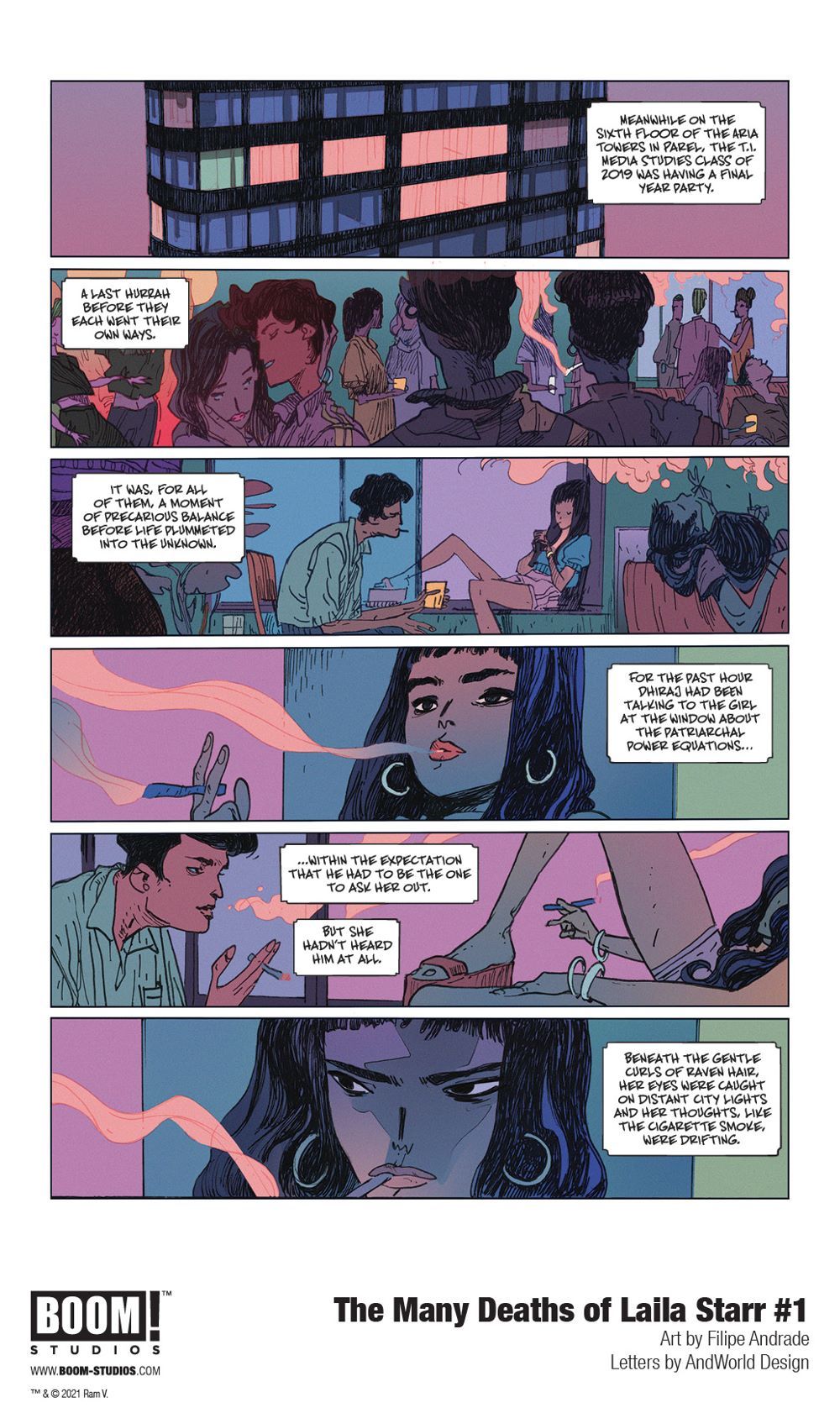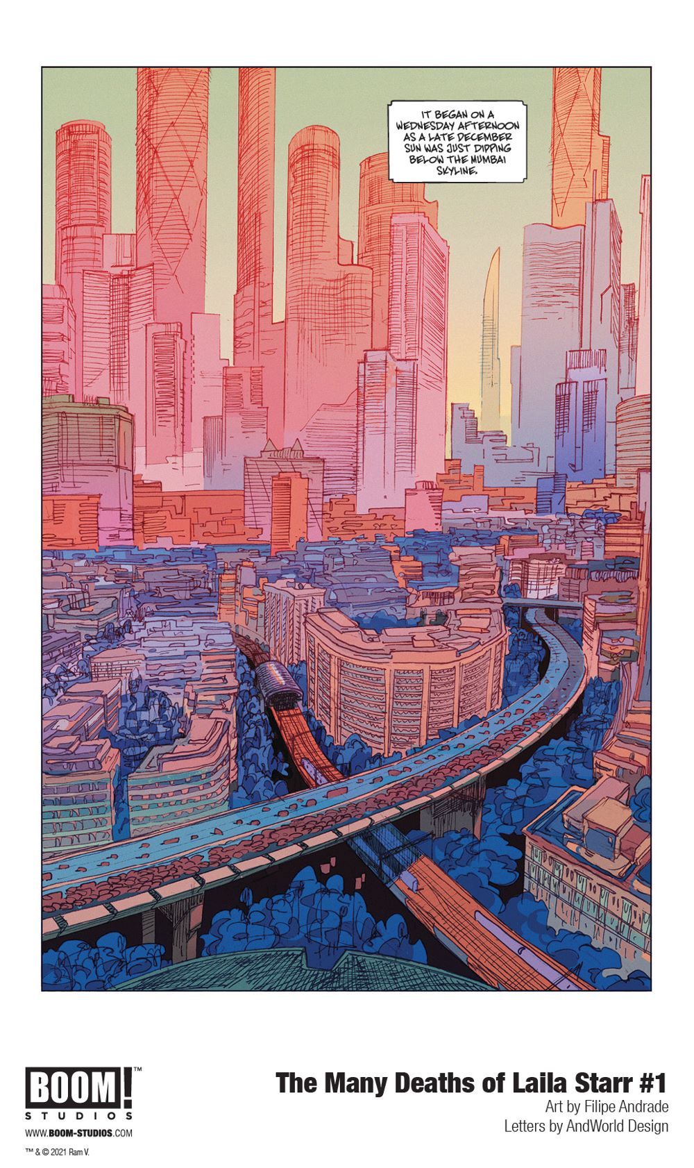 Media Release -- BOOM! Studios today revealed a first look at THE MANY DEATHS OF LAILA STARR #1, the first issue in a new original series from acclaimed comics creator Ram V (Swamp Thing, Blue in Green), superstar artist Filipe Andrade (Captain Marvel) and letterer AndWorld Design, that explores the fine line between living and dying in Mumbai through the lens of magical realism, available in April 2021.
