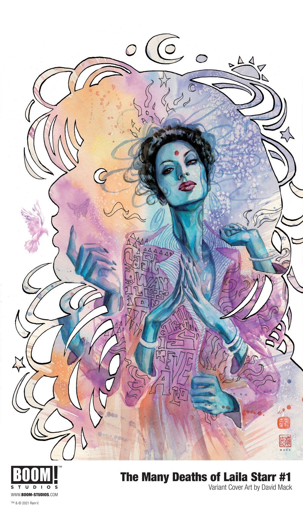 THE MANY DEATHS OF LAILA STARR #1 features main cover art by series artist Andrade and variant covers by famed illustrator David Mack (Cover, Jessica Jones), and acclaimed artist Anand RK (Blue in Green).