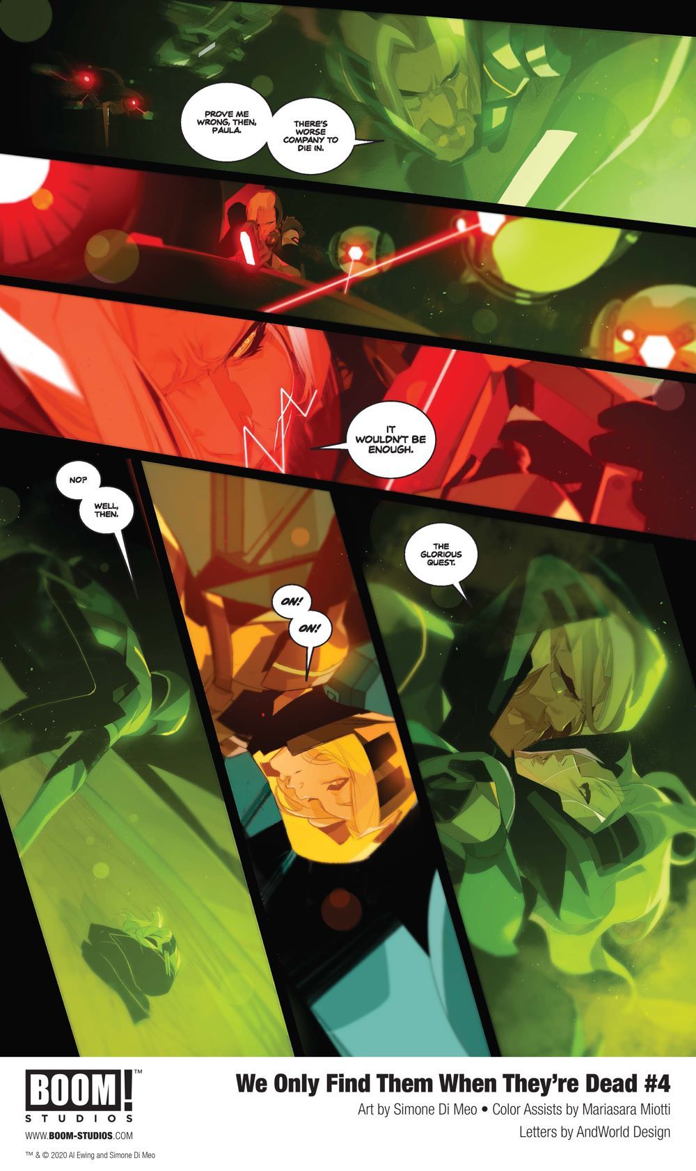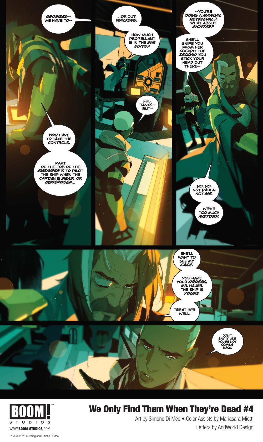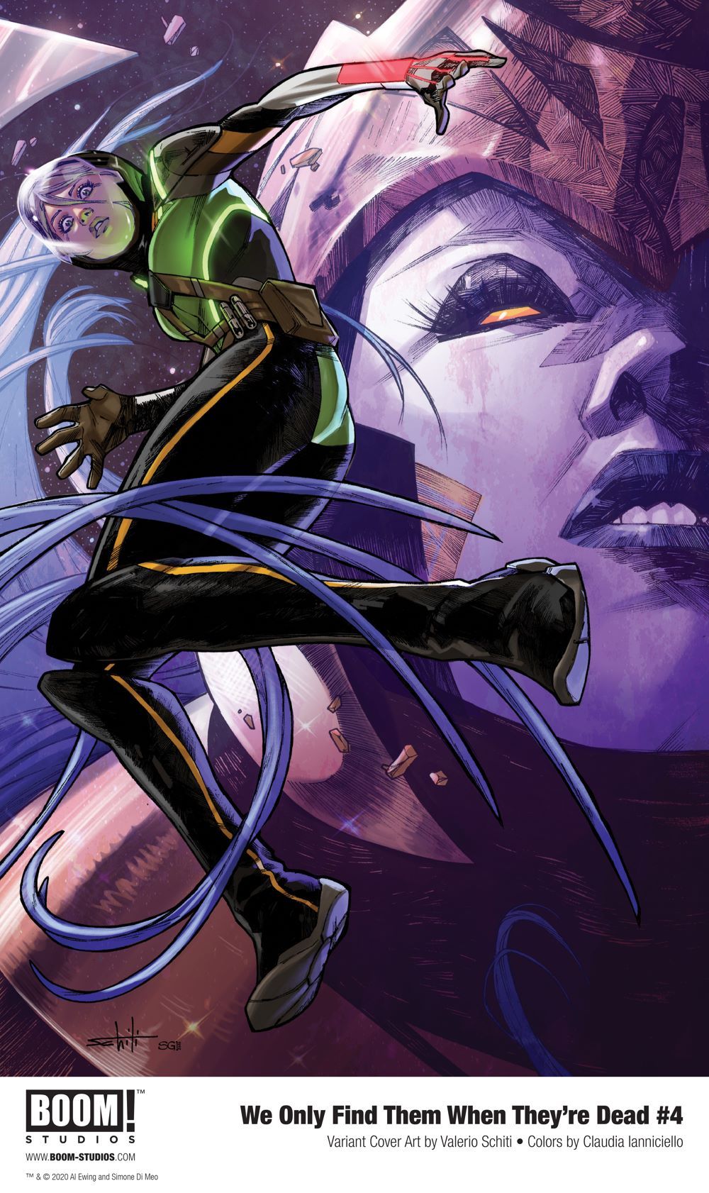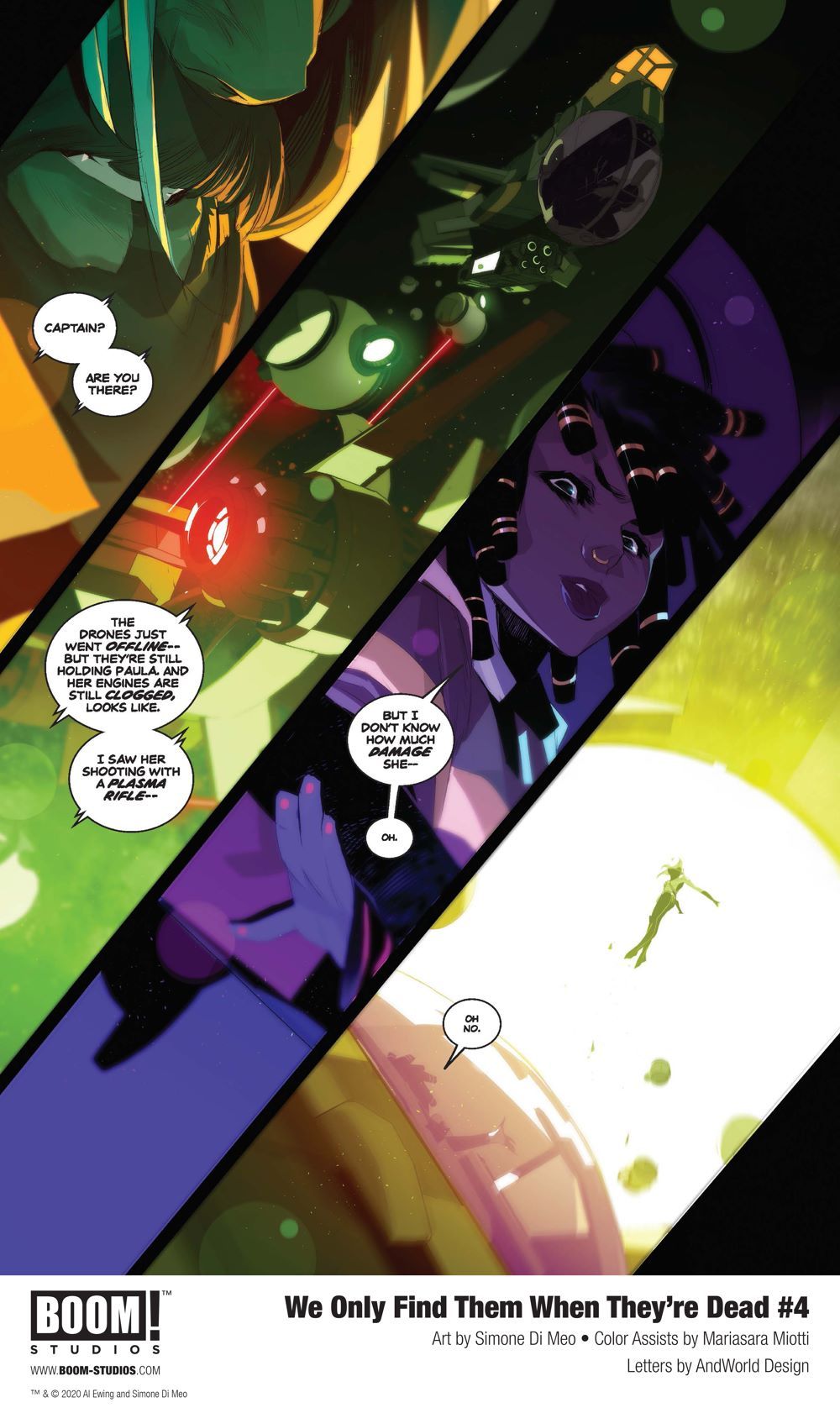 Media Release -- BOOM! Studios today revealed a first look at WE ONLY FIND THEM WHEN THEY'RE DEAD #4, the sci-fi epic from Al Ewing (Immortal Hulk) and Simone Di Meo (Mighty Morphin Power Rangers), with color assistance by Mariasara Miotti and letters by AndWorld Design, about one man's unrelenting quest throughout space to discover the truth—no matter where it takes him. Available in stores December 16, 2020.