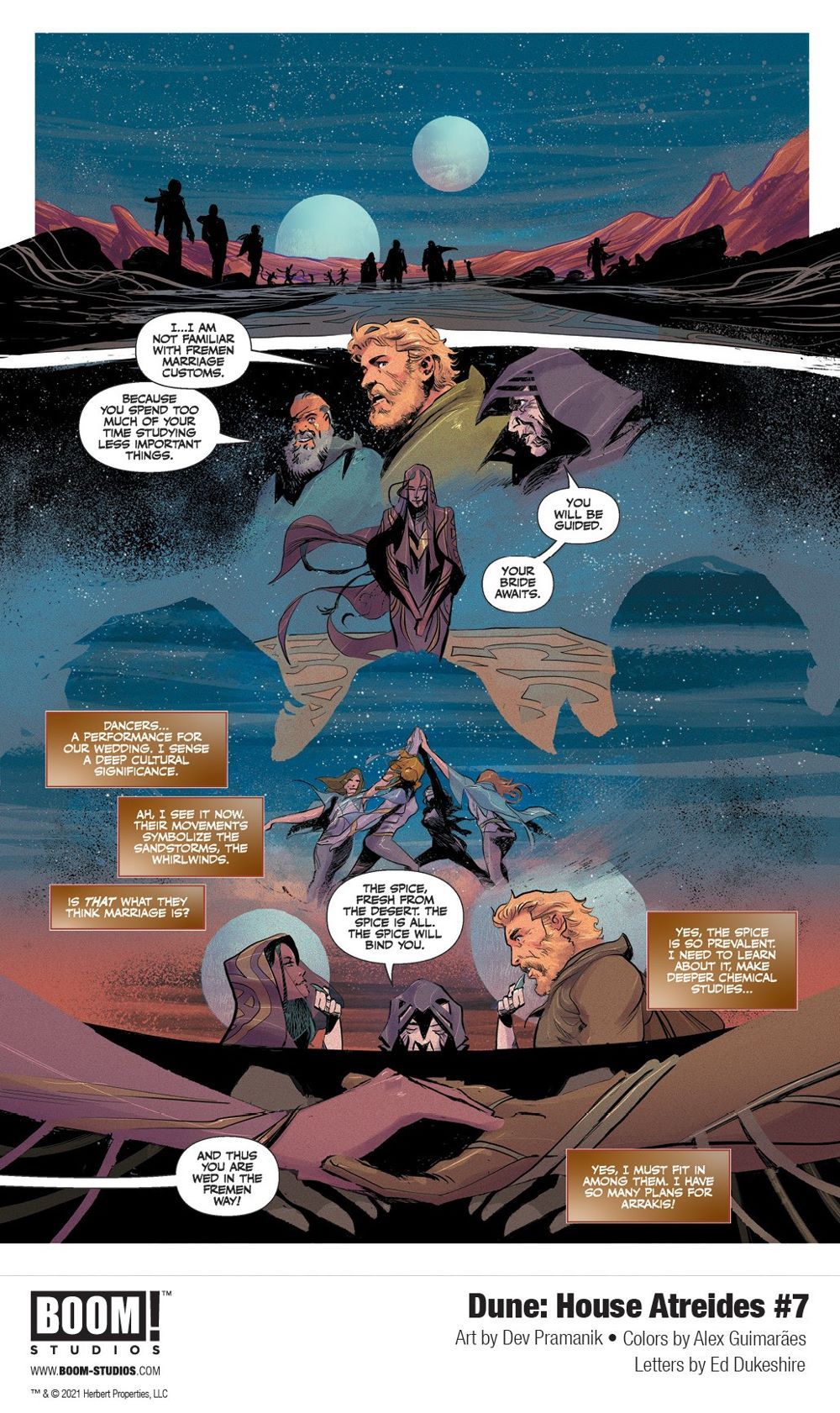 Media Release -- BOOM! Studios today revealed a first look at DUNE: HOUSE ATREIDES #7, adapted & scripted by Brian Herbert and Kevin J. Anderson, who co-wrote the eponymous prequel novel based on Frank Herbert's notes and illustrated by artist Dev Pramanik (Paradiso), colorist Alex Guimarães (Bone Parish) and letterer Ed Dukeshire (Once & Future), in partnership with Herbert Properties LLC and in full coordination with Abrams ComicArts, who published the first of three graphic novel adaptations of Herbert's original classic novel DUNE in Fall 2020.