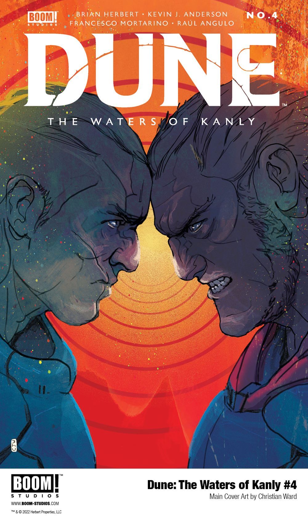 Media Release -- BOOM! Studios today revealed a first look at DUNE: THE WATERS OF KANLY #4, the final issue of a four-issue comic book series expanding the rich mythology of Frank Herbert's Dune, adapted & scripted by New York Times bestselling authors Brian Herbert and Kevin J. Anderson, illustrated by artist Francesco Mortarino (Power Rangers), colored by Raúl Angulo (Go Go Power Rangers), and lettered by Ed Dukeshire (Once & Future), in partnership with Herbert Properties LLC and in full coordination with Abrams ComicArts, who published the first of a trilogy of graphic novel adaptations of Herbert's original classic novel DUNE in Fall 2020.