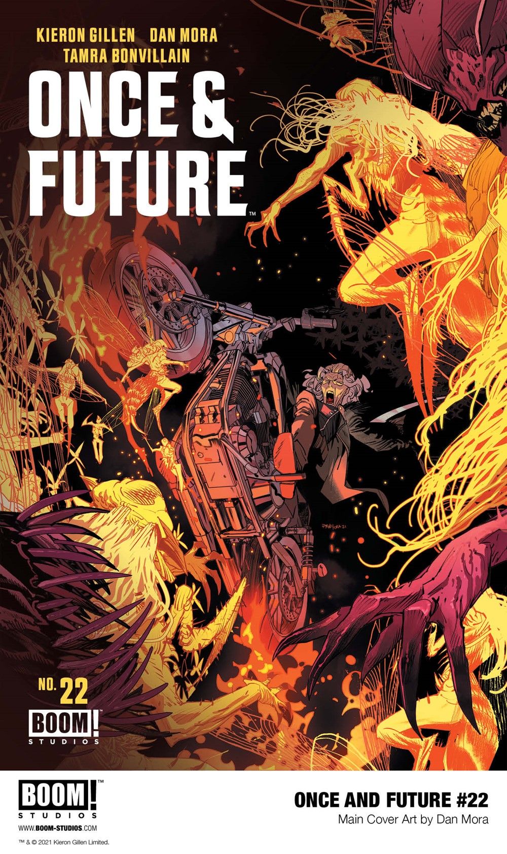 Media Release -- BOOM! Studios revealed today the first look at ONCE & FUTURE #22, the continuation of a new story arc in the critically acclaimed series from New York Times bestselling writer Kieron Gillen (The Wicked + The Divine, Star Wars), Russ Manning Award-winning artist Dan Mora (Buffy the Vampire Slayer, Klaus), colorist Tamra Bonvillain (Captain Marvel), and letterer Ed Dukeshire (The Red Mother), about retired monster hunter Bridgette McGuire, her unsuspecting grandson Duncan, and their intrepid ally Rose who protect their nation from legends and myths risen from the grave to battle for dominion over the land, available in November 2021.