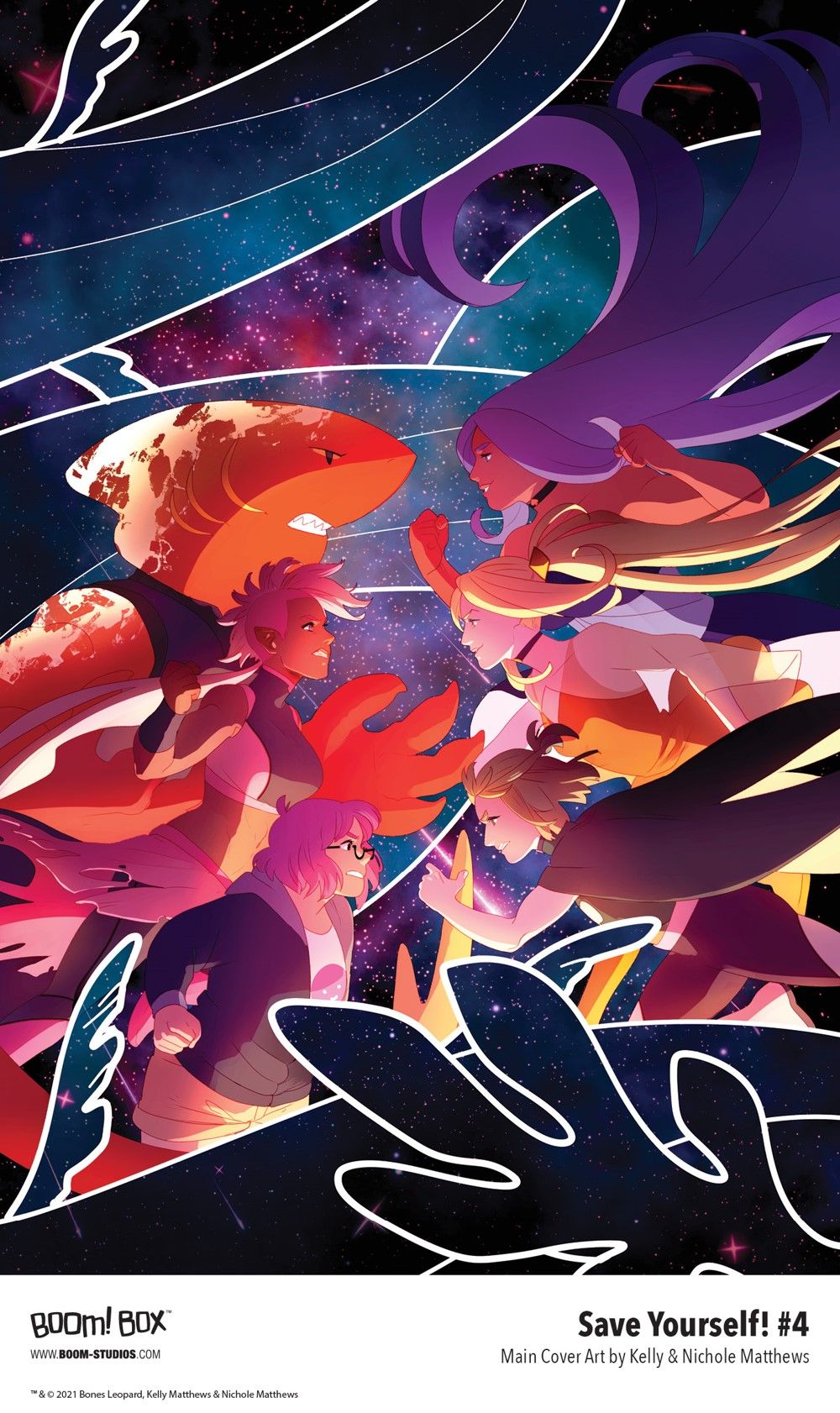 Media Release -- BOOM! Studios today revealed a first look at SAVE YOURSELF! #4, the final issue in a truly magical four-issue original series from the team behind Pandora’s Legacy, writer Bones Leopard (Identical), artists Kelly & Nichole Matthews (Just Beyond), and letterer Jim Campbell, that’s perfect for fans who grew up loving magical girls and are ready to step up and save the world, no matter who they have to face, available in September 2021.