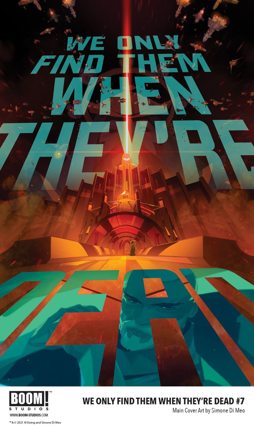 Media Release -- BOOM! Studios today revealed a first look at WE ONLY FIND THEM WHEN THEY'RE DEAD #7, the sci-fi epic from Al Ewing (Immortal Hulk) and Simone Di Meo (Mighty Morphin Power Rangers), with color assistance by Mariasara Miotti and letters by AndWorld Design, the next issue of a brand new story arc set in a universe that revolves around mining the corpses of dead gods and a conflict that threatens to tear apart the galaxy. Available in stores June 30, 2021.