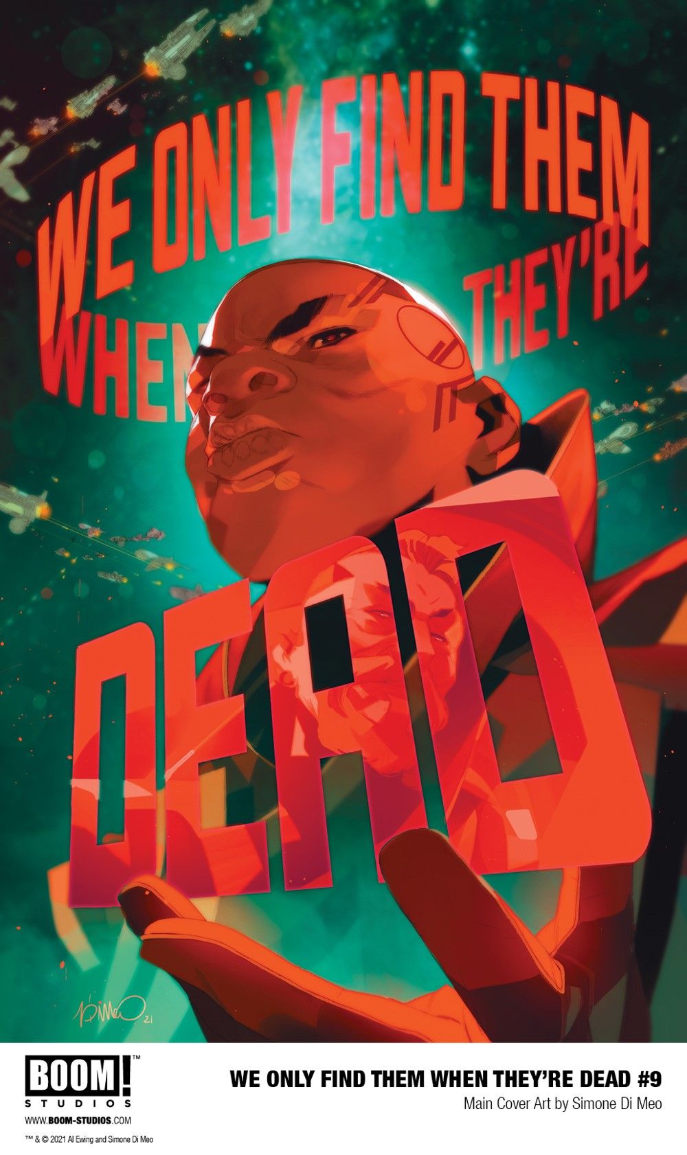 Media Release -- BOOM! Studios today revealed a first look at WE ONLY FIND THEM WHEN THEY'RE DEAD #9, the next issue in the sci-fi epic from Al Ewing (Immortal Hulk) and Simone Di Meo (Mighty Morphin Power Rangers), with color assistance by Mariasara Miotti and letters by AndWorld Design, set in a universe that revolves around mining the corpses of dead gods and a conflict that threatens to tear apart the galaxy. Available in stores October 27, 2021.
