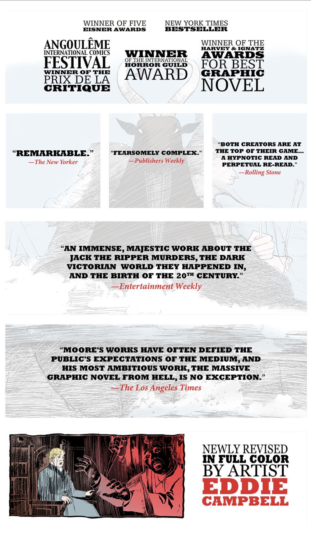 Moore and Campbell's exhaustive investigation of the Whitechapel murders has been a critical favorite and award winner for decades. A New York Times bestseller, From Hell has won five Eisner Awards, the Angoulême International Comics Festival's Prix de la Critique, the Harvey and Ignatz Awards for Best Graphic Novel, and the International Horror Guild Award. A selection of quotes from critics include: