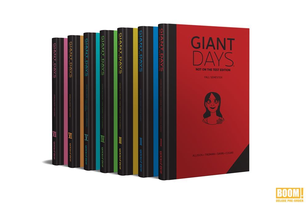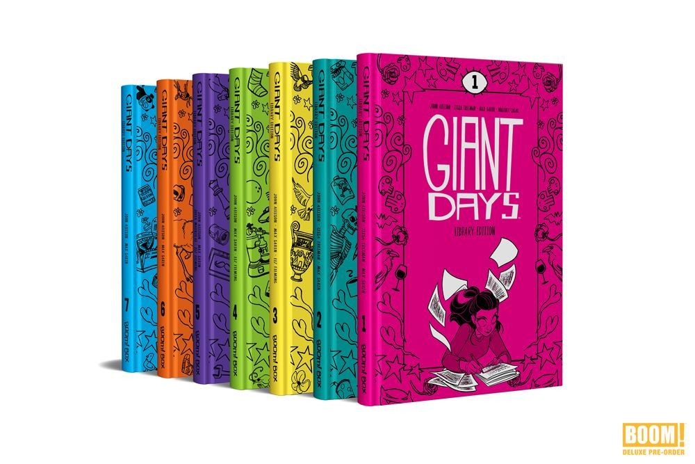 That's where this BOOM! DELUXE PRE-ORDER campaign comes in: To remedy this problem, BOOM! Studios is collecting every page of the historic, award-winning GIANT DAYS in a new LIBRARY EDITION format – winsome, shelf-sturdy, deluxe hardcover tomes that'll package the whole series together in totality across seven volumes for the very first time.