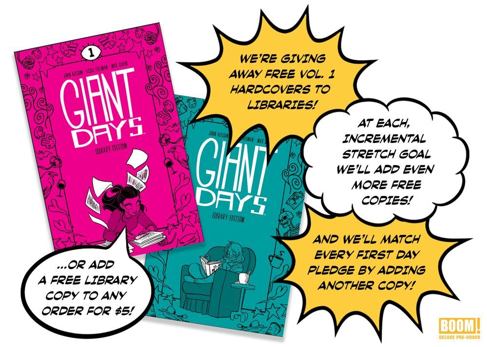 Any librarian wishing to participate can visit the campaign page here https://www.kickstarter.com/projects/boom-studios/giant-days to get information, sign up, and find out how their library can qualify to participate in the giveaway. Better yet: Any campaign backer can add an extra $5 donation to their COMPLETE GIANT DAYS LIBRARY pre-order to add another free volume to the giveaway queue for a graphic novel-loving library!