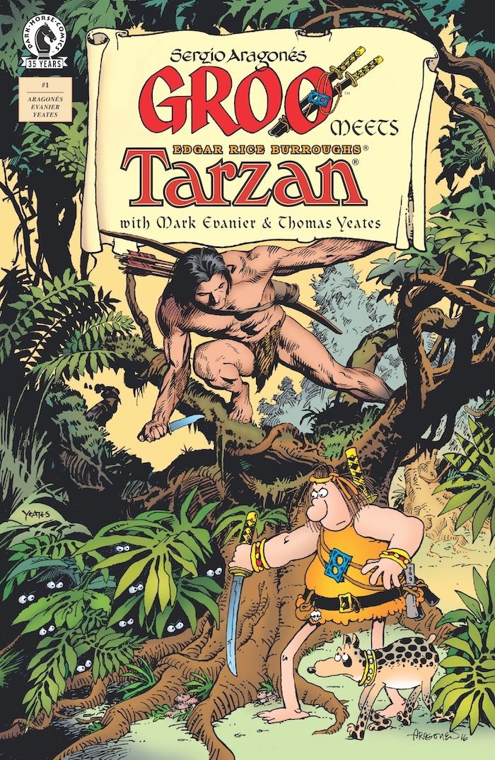 Media Release -- From renowned creators Sergio Aragonés, Mark Evanier, and Thomas Yeates, along with colors from Tom Luth and letters by Stan Sakai, comes the fun, meta, crossover comic Groo Meets Tarzan!