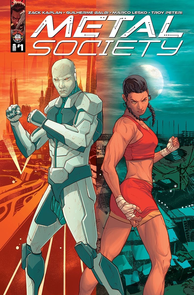 Media Release -- In a future world of robots, extinct humans have been brought back to life—but will they earn their place in society, or will have to fight for it? The forthcoming Image/Top Cow sci-fi mini series—Metal Society by Zack Kaplan (Port of Earth, Eclipse), Guilherme Balbi, Marco Lesko, and Troy Peteri—explores just that with a side of MMA-Style sport fights.
