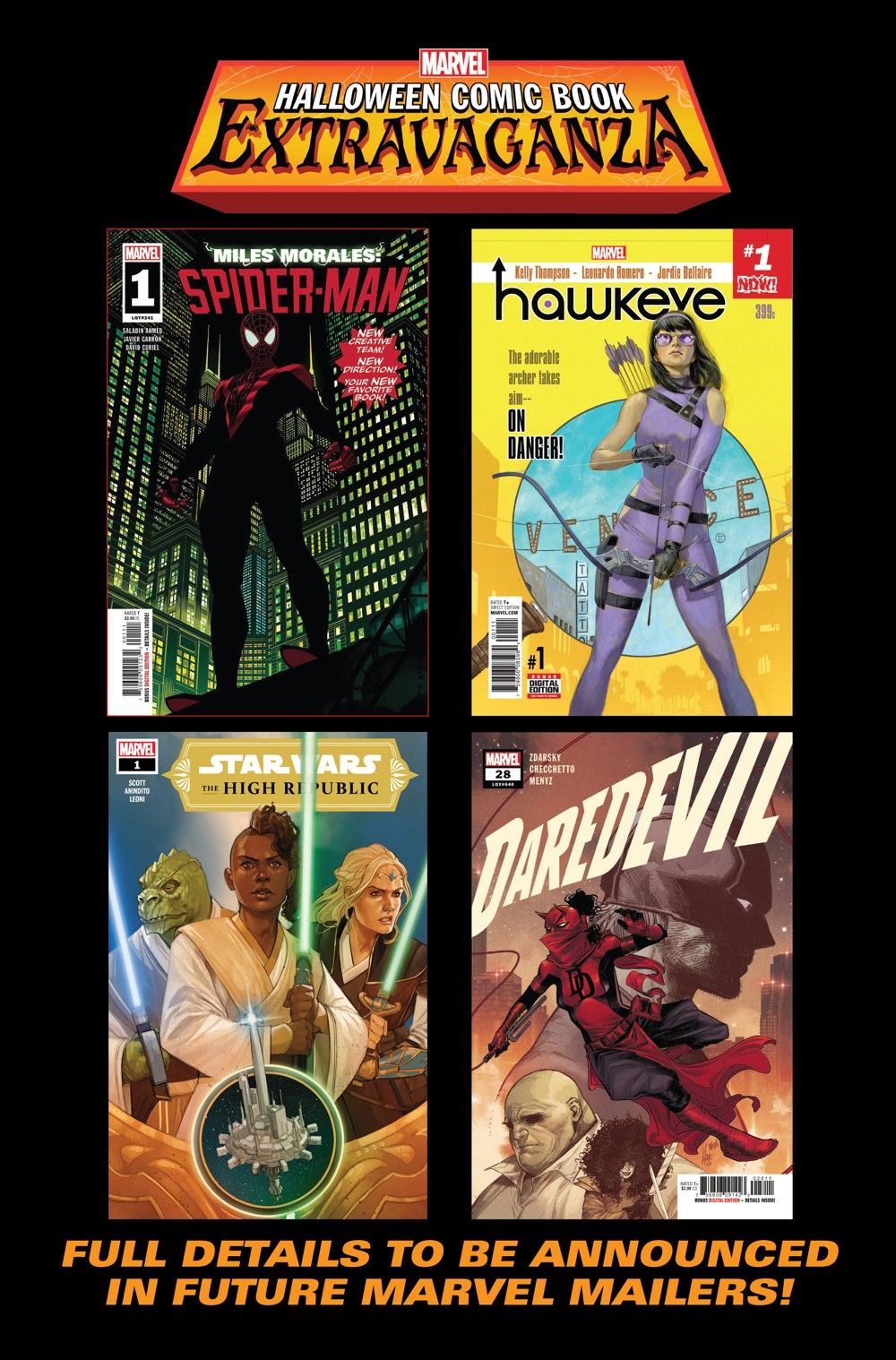 The 2021 MARVEL HALLOWEEN COMIC BOOK EXTRAVAGANZA will feature MILES MORALES: SPIDER-MAN #1, HAWKEYE #1, STAR WARS: THE HIGH REPUBLIC #1, and DAREDEVIL #28.