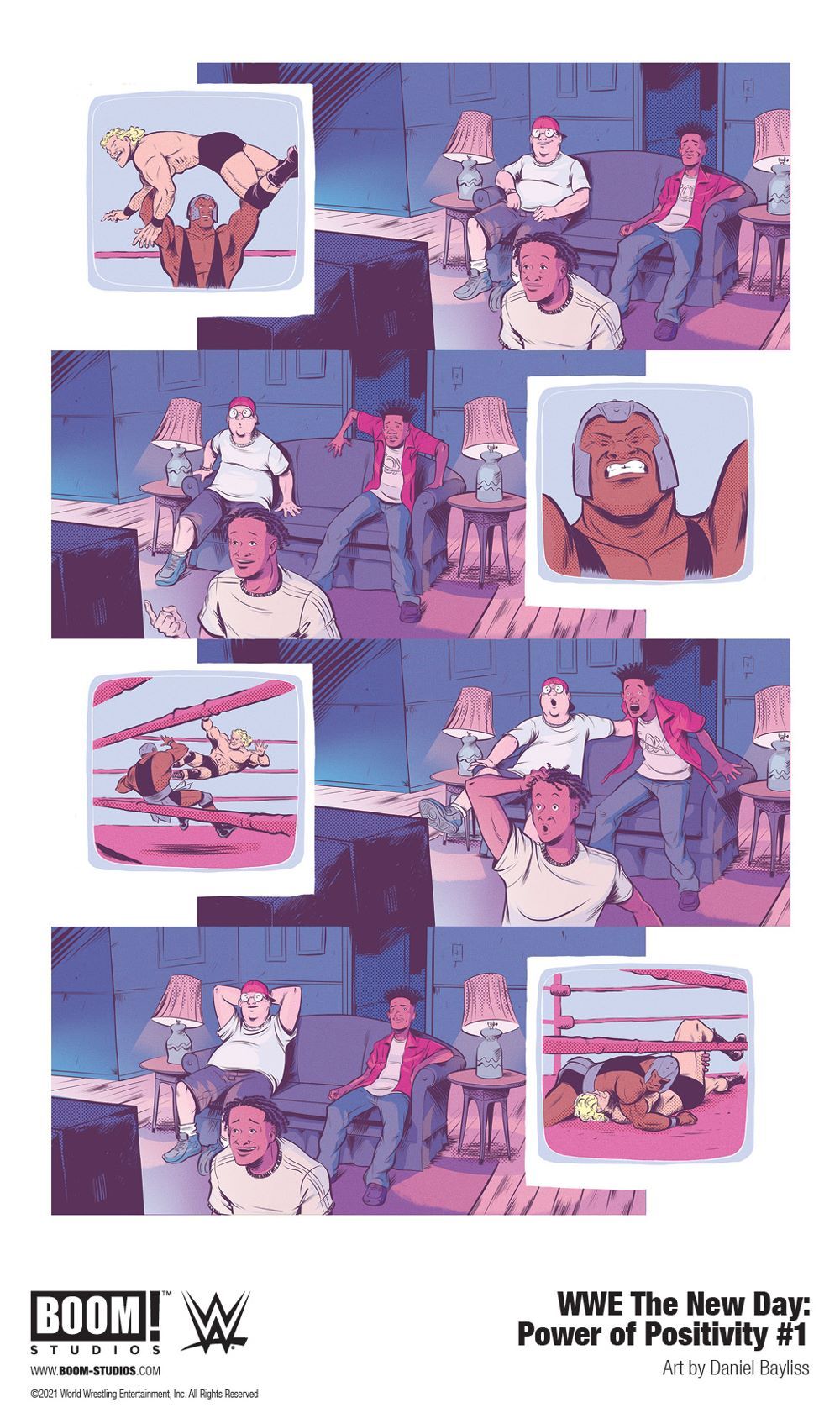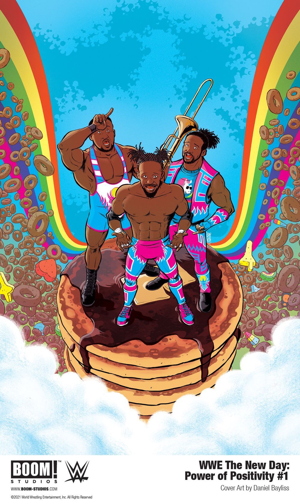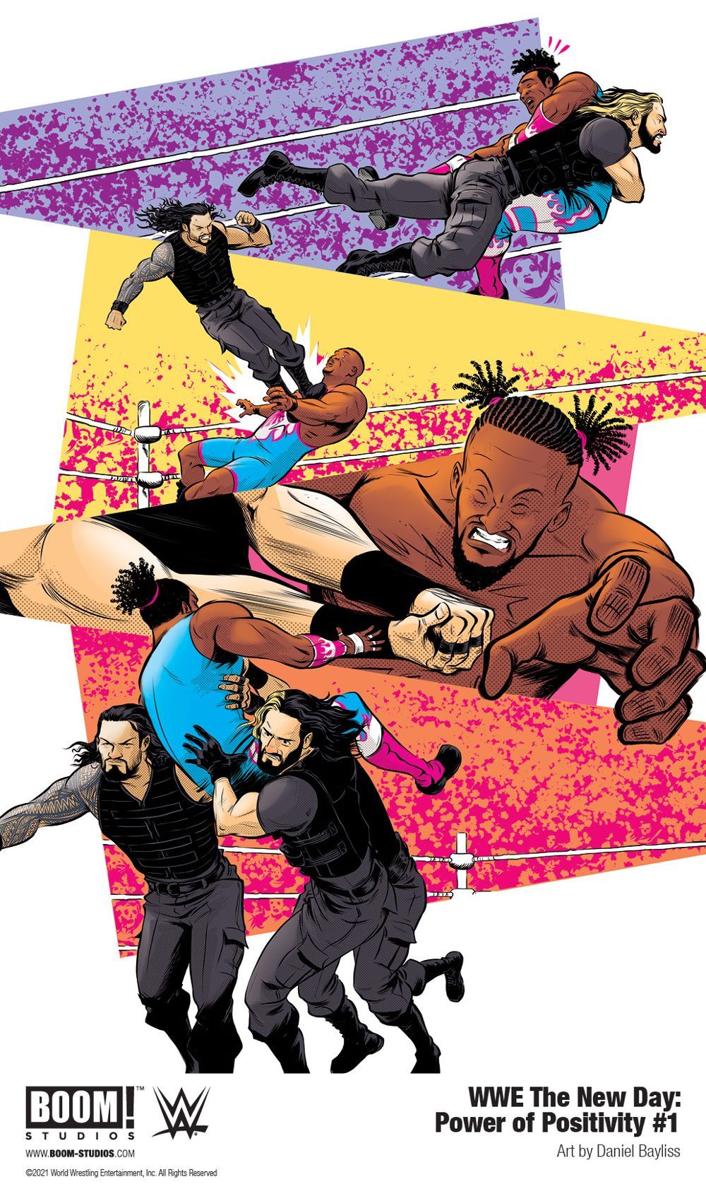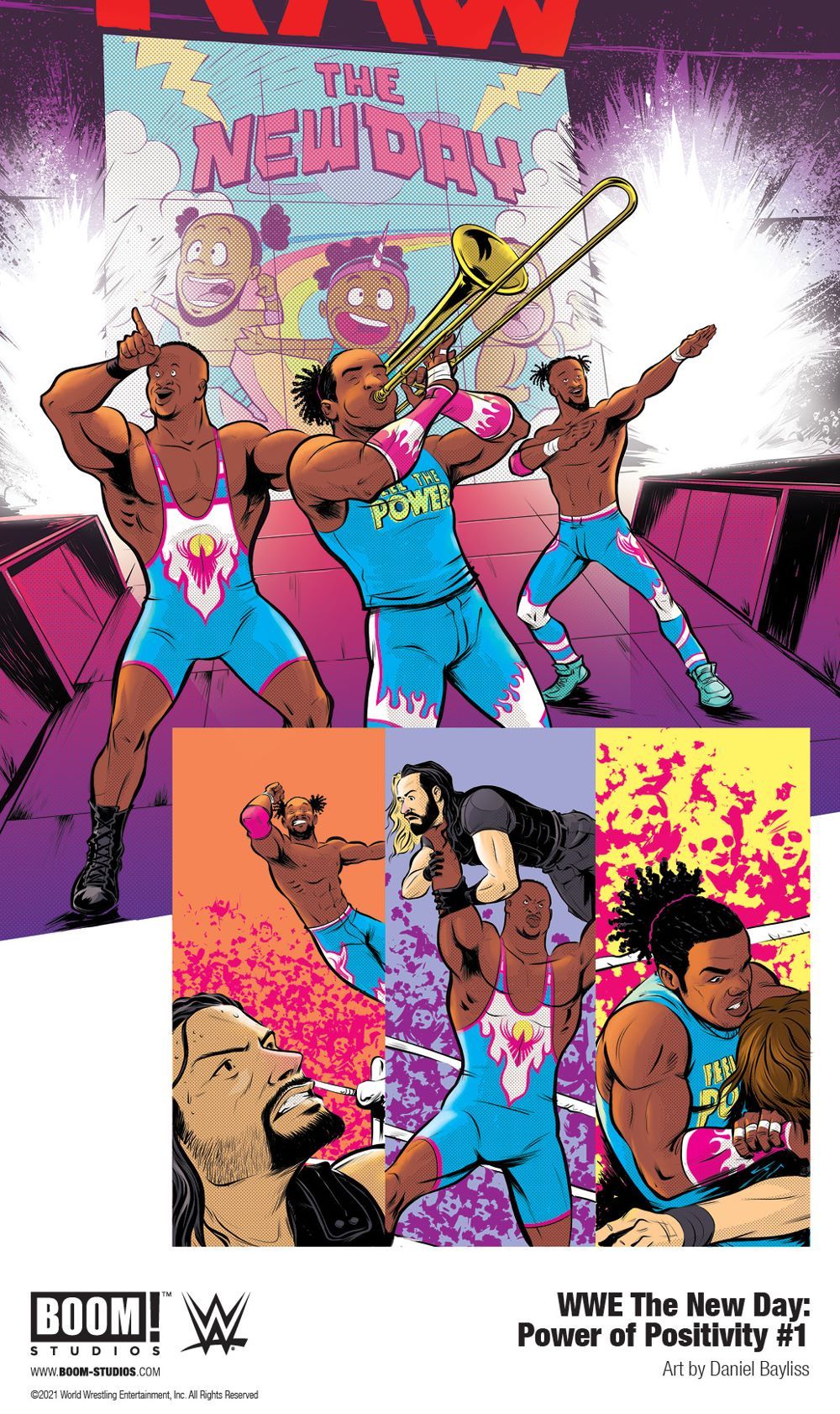 Media Release -- BOOM! Studios, in partnership with WWE, today revealed the brand new two-issue limited series WWE THE NEW DAY: POWER OF POSITIVITY, available in July 2021 featuring WWE Superstars Kofi Kingston, Big E and Xavier Woods, by writers Evan Narcisse (Rise of the Black Panther) and Austin Walker (Friends At The Table), and artist Daniel Bayliss (Mighty Morphin Power Rangers).