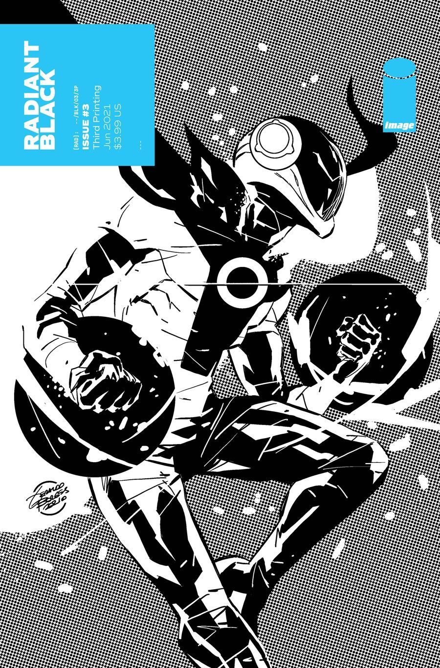 Radiant Black #3, third printing Cover A (Diamond Code APR218885) and Radiant Black #3, third printing Cover B 1:10 B&W (Diamond Code APR218988) will be available at comic book shops on Wednesday, June 23.