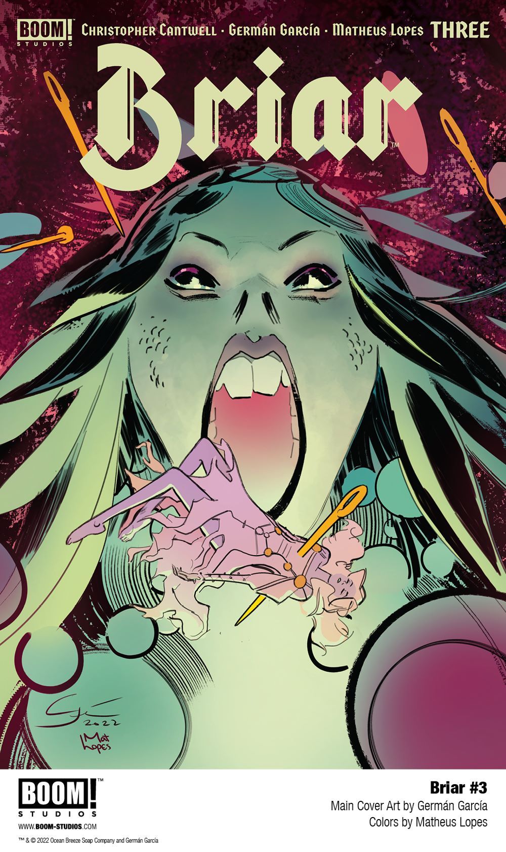 Media Release -- BOOM! Studios revealed today the Raúl Allén (Dune) variant cover of BRIAR #3, the next issue of the brand new four-issue limited comic book series from Eisner Award-nominated writer, producer, and director Christopher Cantwell (Regarding the Matter of Oswald's Body, Iron Man, Halt and Catch Fire), rising star artist Germán García (Ka-Zar: Lord of the Savage Land), colorist Matheus Lopes (Supergirl: Woman of Tomorrow), and letterer AndWorld Design (The Many Deaths of Laila Starr) that reimagines the classic fairy tale as an epic dark fantasy adventure, available January 2023.