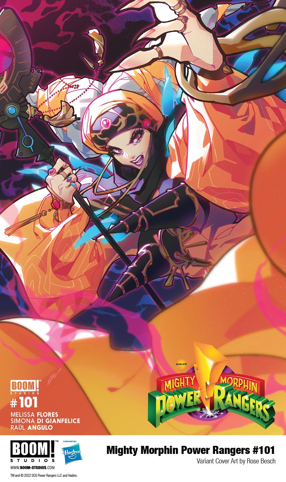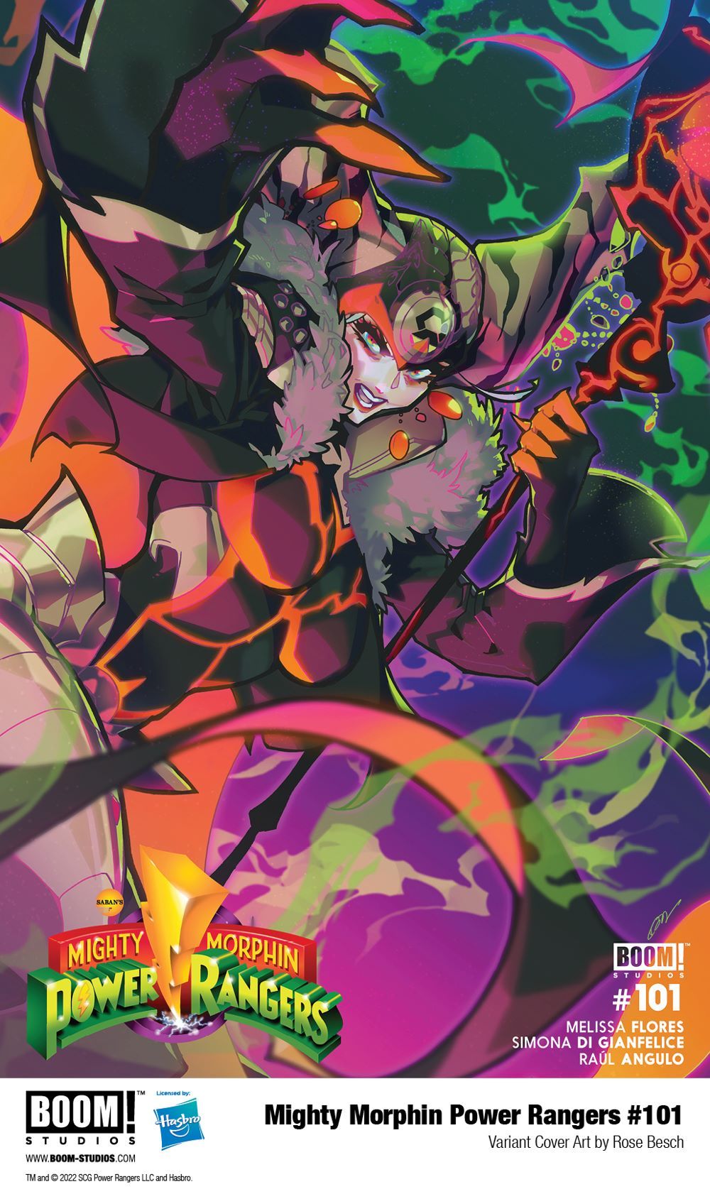 Media Release -- BOOM! Studios, under license by Hasbro, Inc. (NASDAQ: HAS), a global branded entertainment company, revealed variant cover art by Rose Besch for MIGHTY MORPHIN POWER RANGERS #101! The bestselling comic book series based on the global pop culture phenomenon, features a brand new creative team of writer Melissa Flores (The Dead Lucky), artist Simona Di Gianfelice, colorist Raúl Angulo, and letterer Ed Dukeshire. The reunited, recharged era of Power Rangers begins in October 2022!