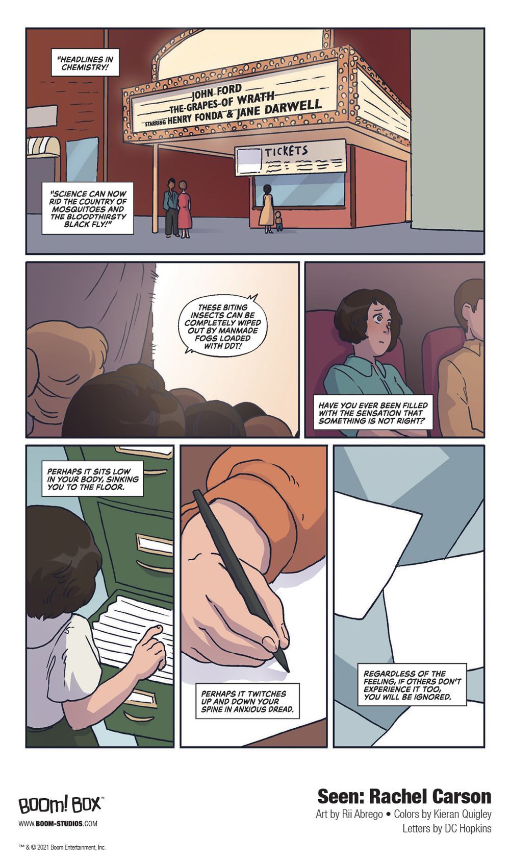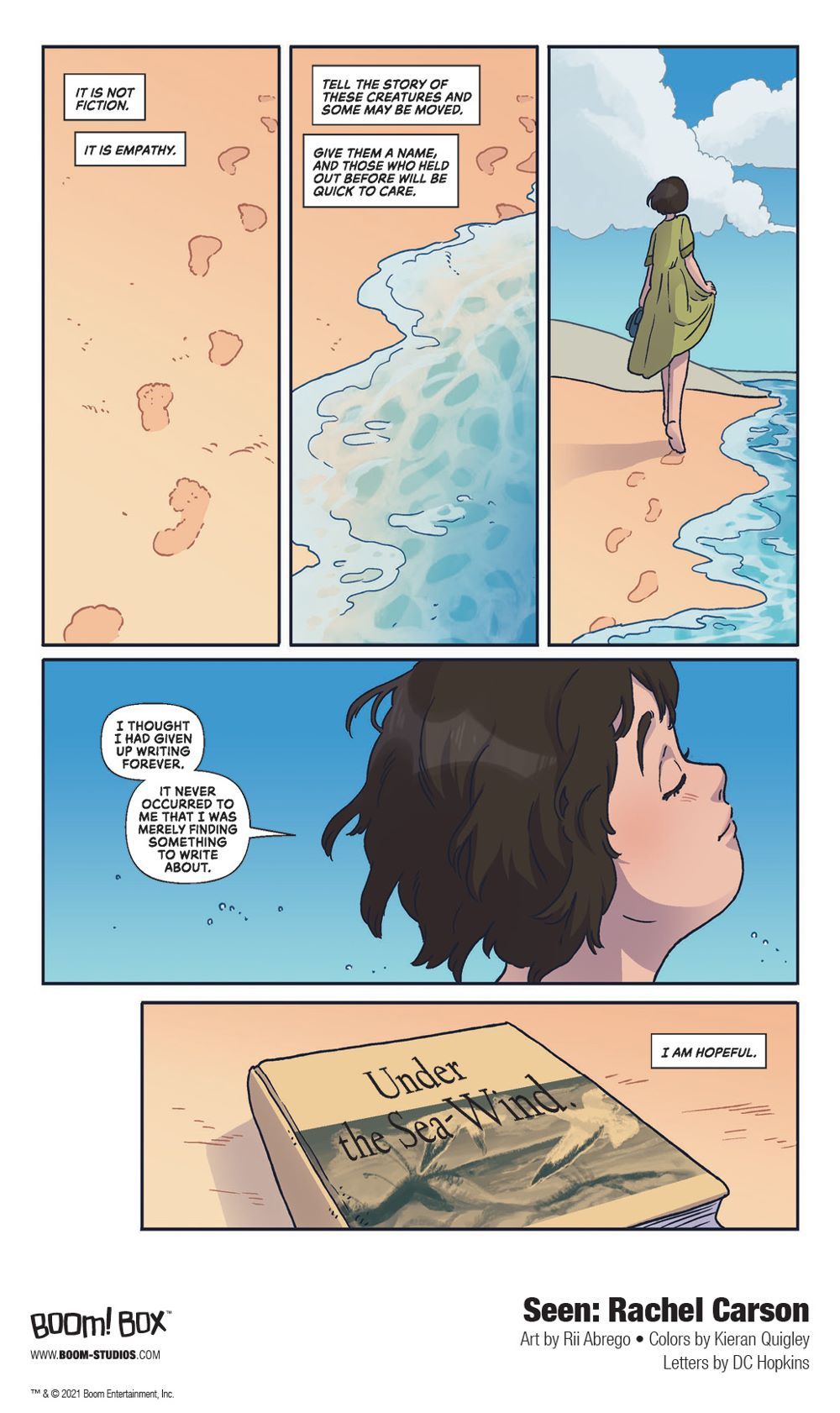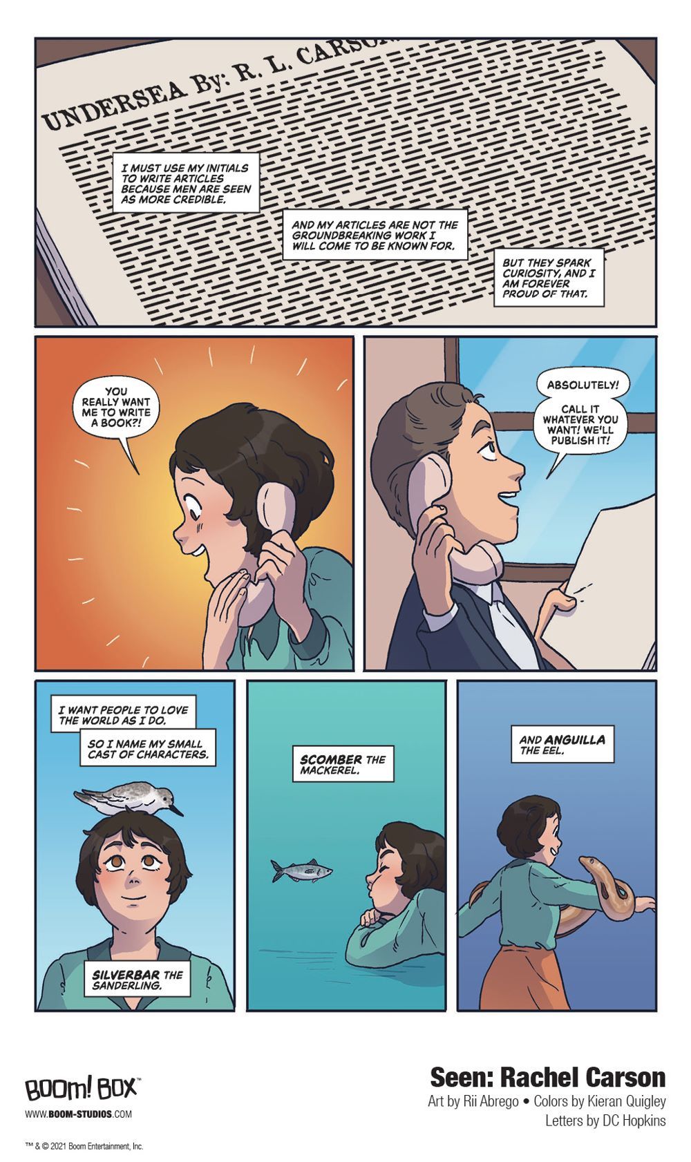SEEN: RACHEL CARSON is the latest release from BOOM! Studios' award-winning BOOM! Box imprint, home to groundbreaking original series such as Lumberjanes by Shannon Watters, Grace Ellis, Brooklyn Allen, and Noelle Stevenson; Giant Days by John Allison, Lissa Treiman, and Max Sarin; The Last Witch by Conor McCreery and V.V. Glass; Juliet Takes a Breath by Gabby Rivera and Celia Moscote; The Avant-Guards by Carly Usdin and Noah Hayes; Fence by C.S. Pacat and Johanna the Mad; and Goldie Vance by Hope Larson and Brittney Williams.