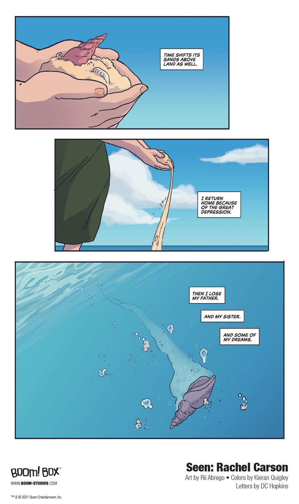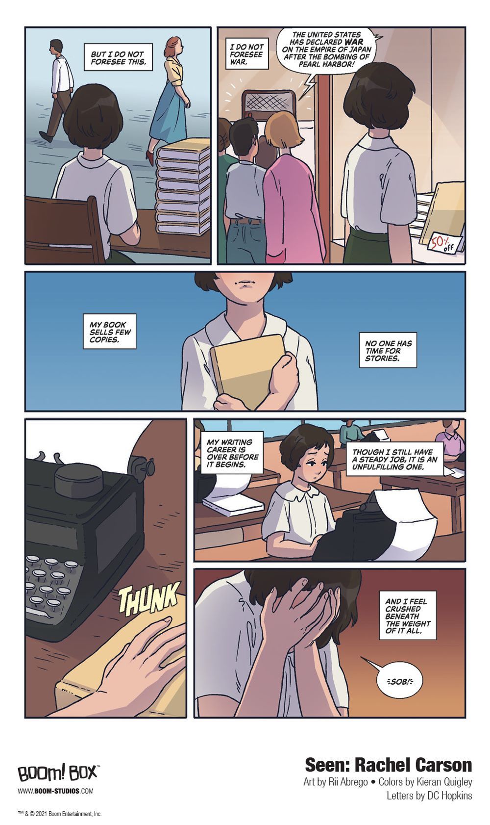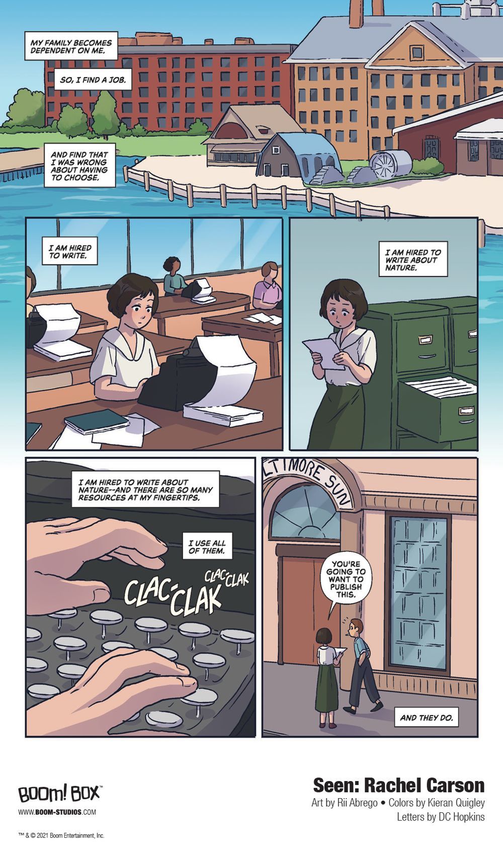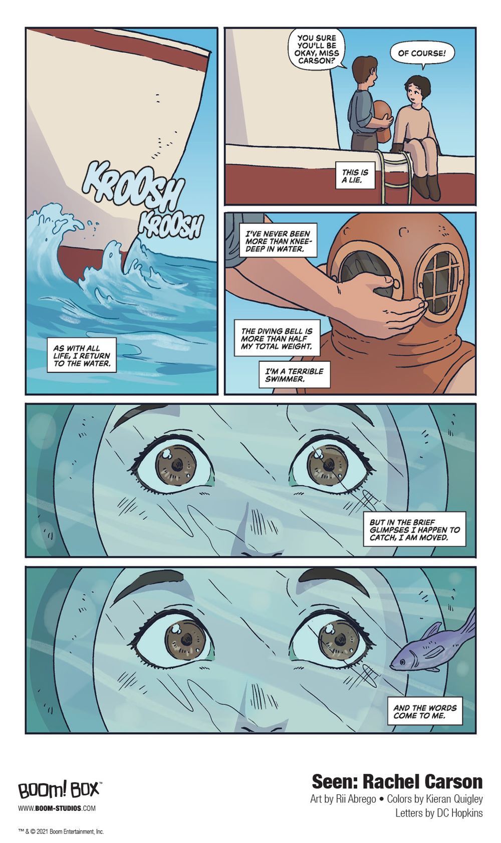 SEEN: RACHEL CARSON is the latest release from BOOM! Studios' award-winning BOOM! Box imprint, home to groundbreaking original series such as Lumberjanes by Shannon Watters, Grace Ellis, Brooklyn Allen, and Noelle Stevenson; Giant Days by John Allison, Lissa Treiman, and Max Sarin; The Last Witch by Conor McCreery and V.V. Glass; Juliet Takes a Breath by Gabby Rivera and Celia Moscote; The Avant-Guards by Carly Usdin and Noah Hayes; Fence by C.S. Pacat and Johanna the Mad; and Goldie Vance by Hope Larson and Brittney Williams.