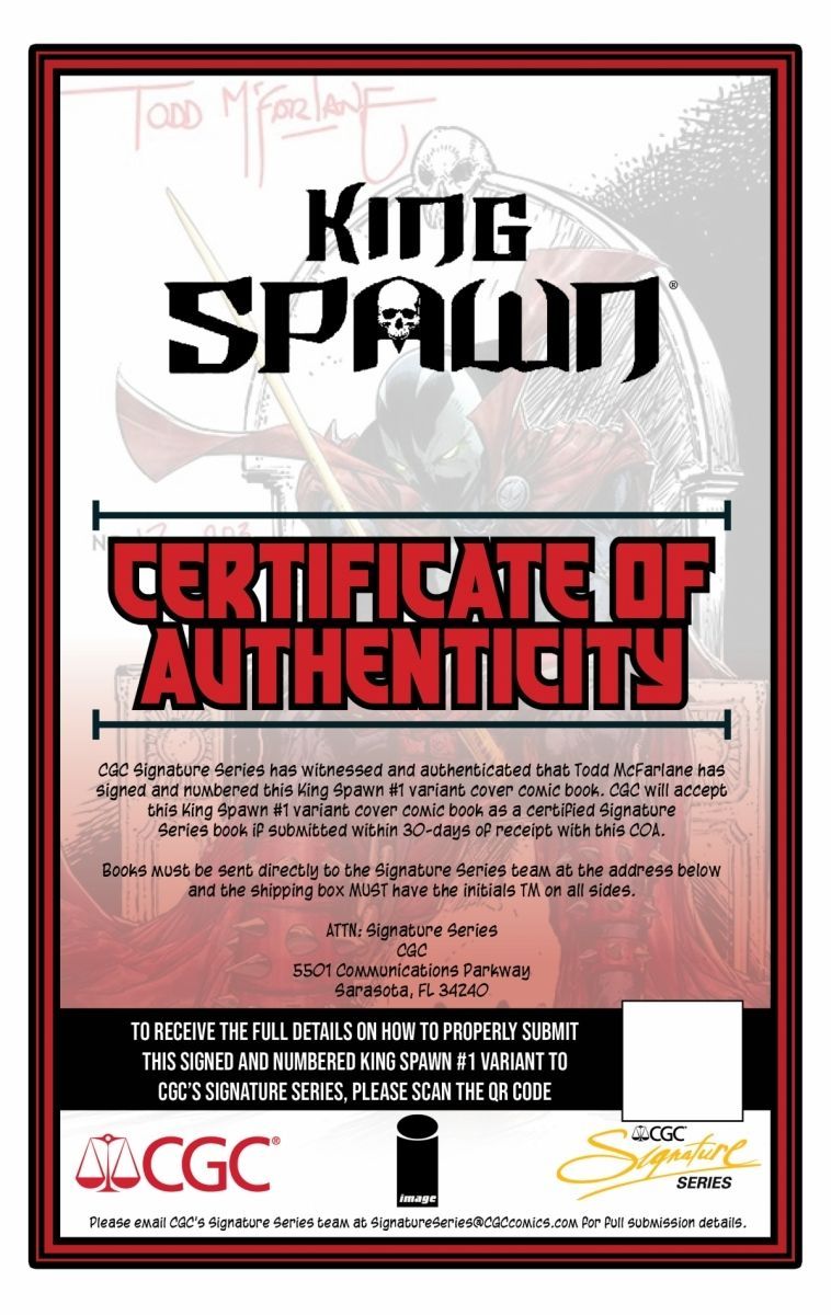 Media Release -- CGC is teaming up with Todd McFarlane for an exclusive Signature Series graded option for the highly anticipated King Spawn #1 limited quantity Signed 1:250 Retailer Incentive variant cover. Each individual ultra limited-edition King Spawn #1 variant comic book will now receive a certificate of authenticity granted by CGC with each signed copy when customers submit their enclosed CGC coupon to have it graded and sent back to them with a yellow CGC SIGNATURE SERIES LABEL included (any fees associated with grading remains the responsibility of the customer). CGC will have an authorized witness at the signing with McFarlane and to further protect the authenticity and security of each signature, advanced measures have been taken so the COA cannot be replicated. Also, in order to receive a Signature Series grade the following instructions MUST be followed.