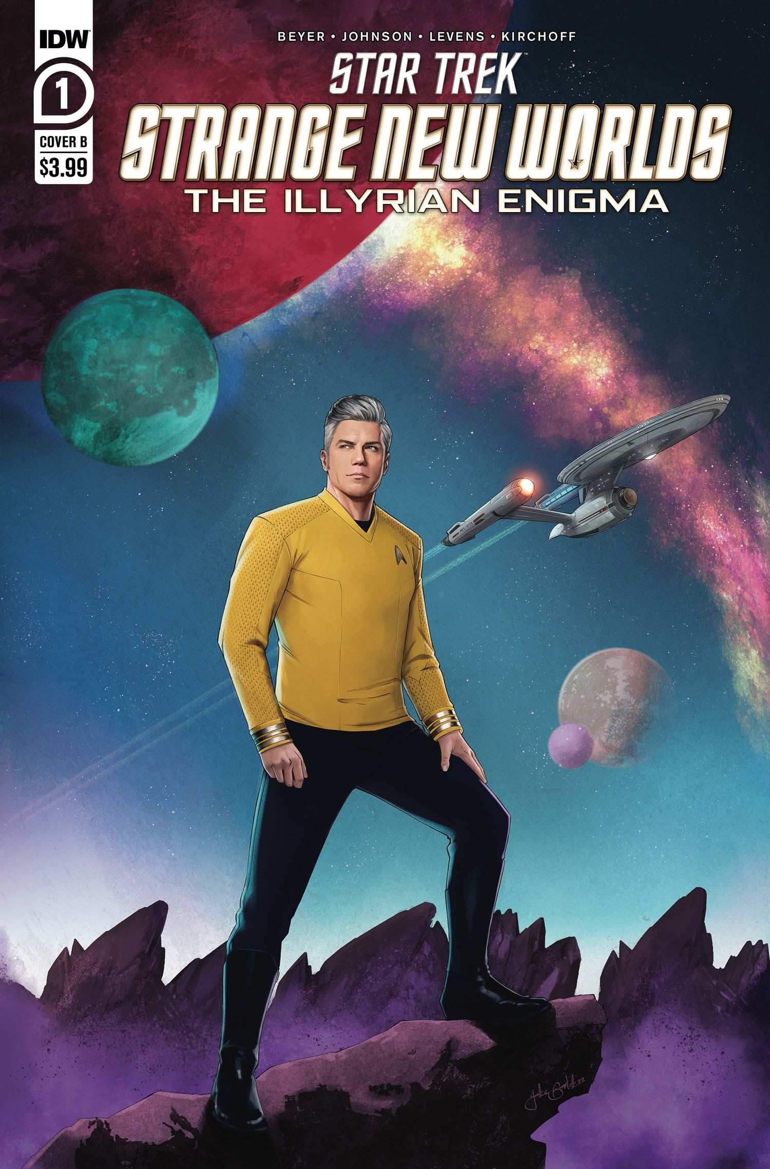 The four-issue Illyrian Enigma reunites the acclaimed co-executive producer for Star Trek: Strange New Worlds Kirsten Beyer and prolific Star Trek author Mike Johnson, whose recent collaborations include the miniseries Star Trek: Discovery–Adventures in the 32nd Century and Star Trek: Picard–Stargazer. Fan-favorite artist Megan Levens (Star Trek: The Mirror War–Troi, Star Wars Adventures) and colorist Charlie Kirchoff (Star Trek: Year Five) also join the creative team, bringing this far-flung space adventure to vibrant life on the comic page.