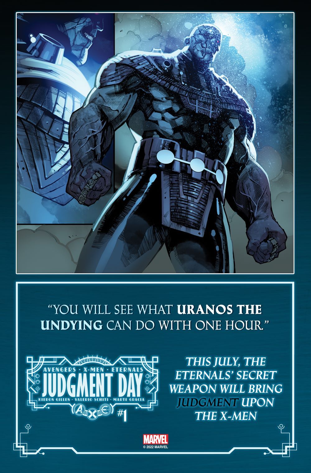 Media Release -- The Marvel Universe braces itself for JUDGMENT DAY! Written by mastermind talent Kieron Gillen and featuring the grand-scale artwork of Valerio Schiti and color artist Marte Gracia, A.X.E.: JUDGMENT DAY is an upcoming Marvel Comics event that kicks off when the Eternals start a vicious war with their new immortal rivals—the X-Men! The Eternals' plan for mutant annihilation will include unleashing the most brutal members of their species starting with URANOS THE UNDYING! Imprisoned for millions of years, the grand-uncle of Thanos will be instrumental in the conflict, leading the attack against the new mutant planet of Arakko.