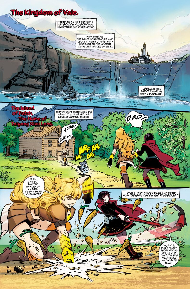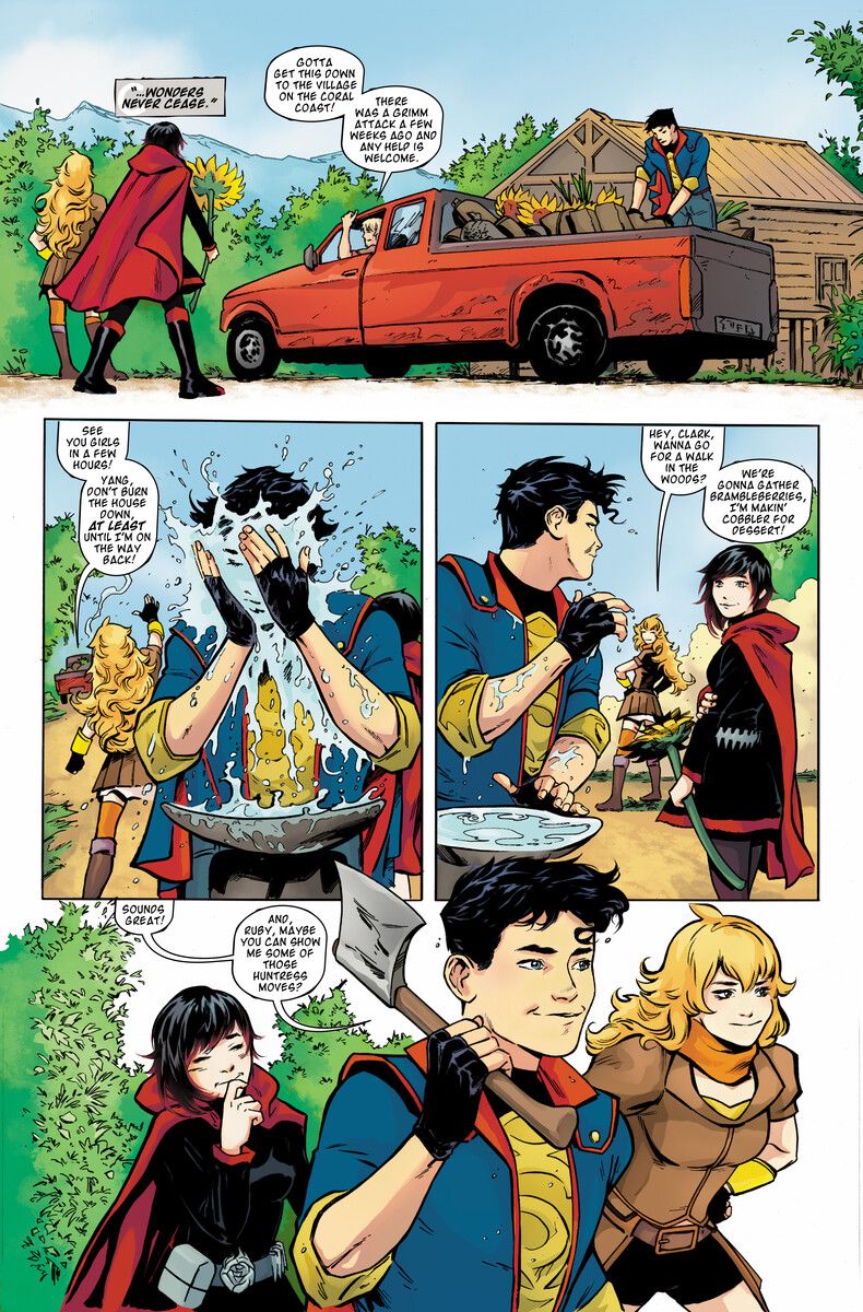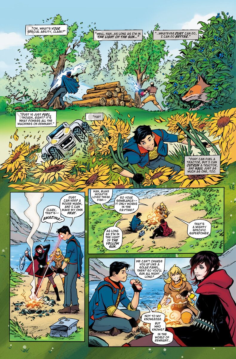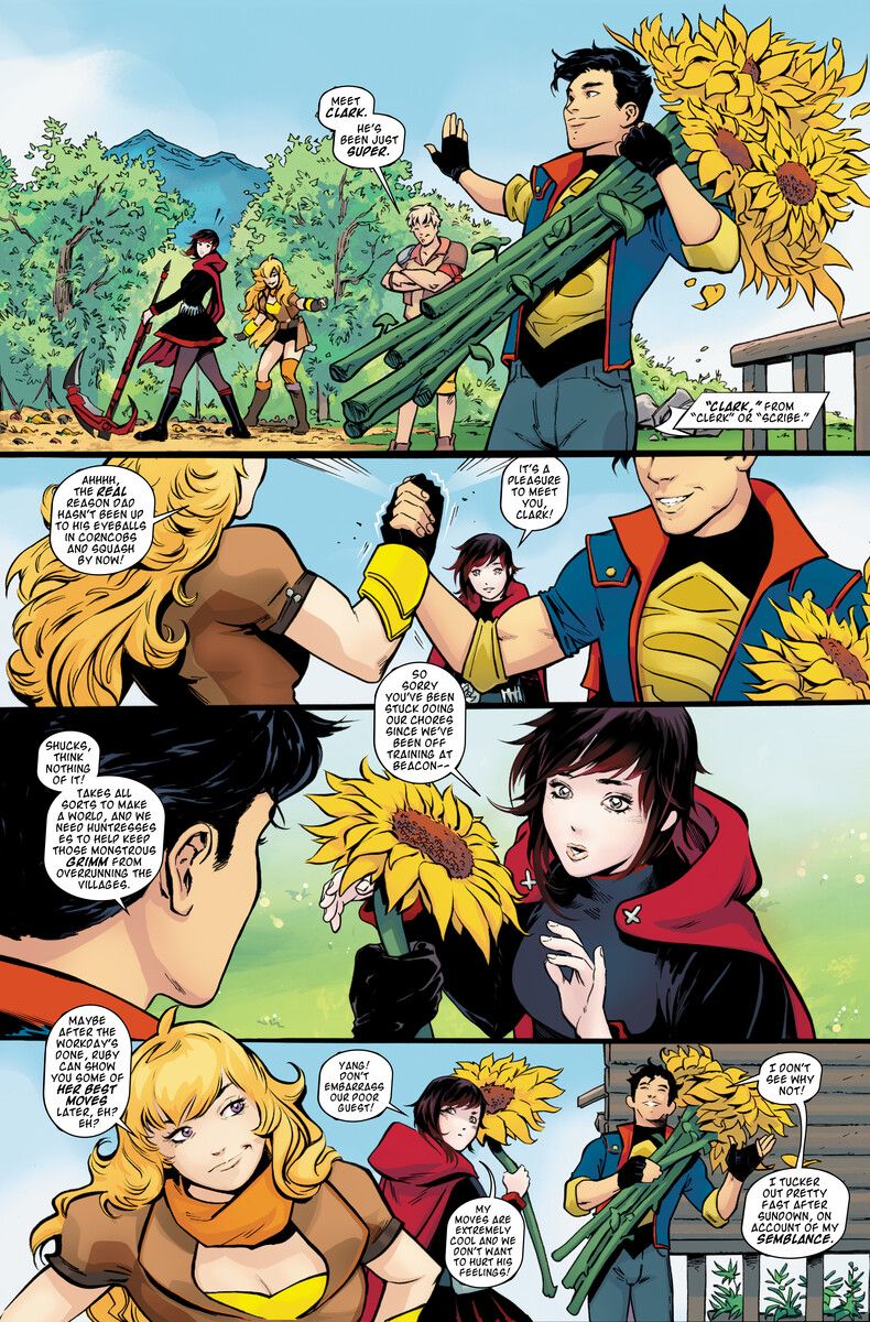 RWBY/Justice League introduces fans of manga and superheroes to the Bruce Wayne, Clark Kent and Diana Prince of Remnant, fighting with Team RWBY. A new Grimm is running rampant across the island of Patch, and Ruby and Yang must team up with a young red and blue-clad farm boy to stop it! Meanwhile, Blake meets a mysterious woman who's suddenly appeared on Menagerie, but her purpose for being there remains a secret. And why does she act like she hasn't been around modern society?