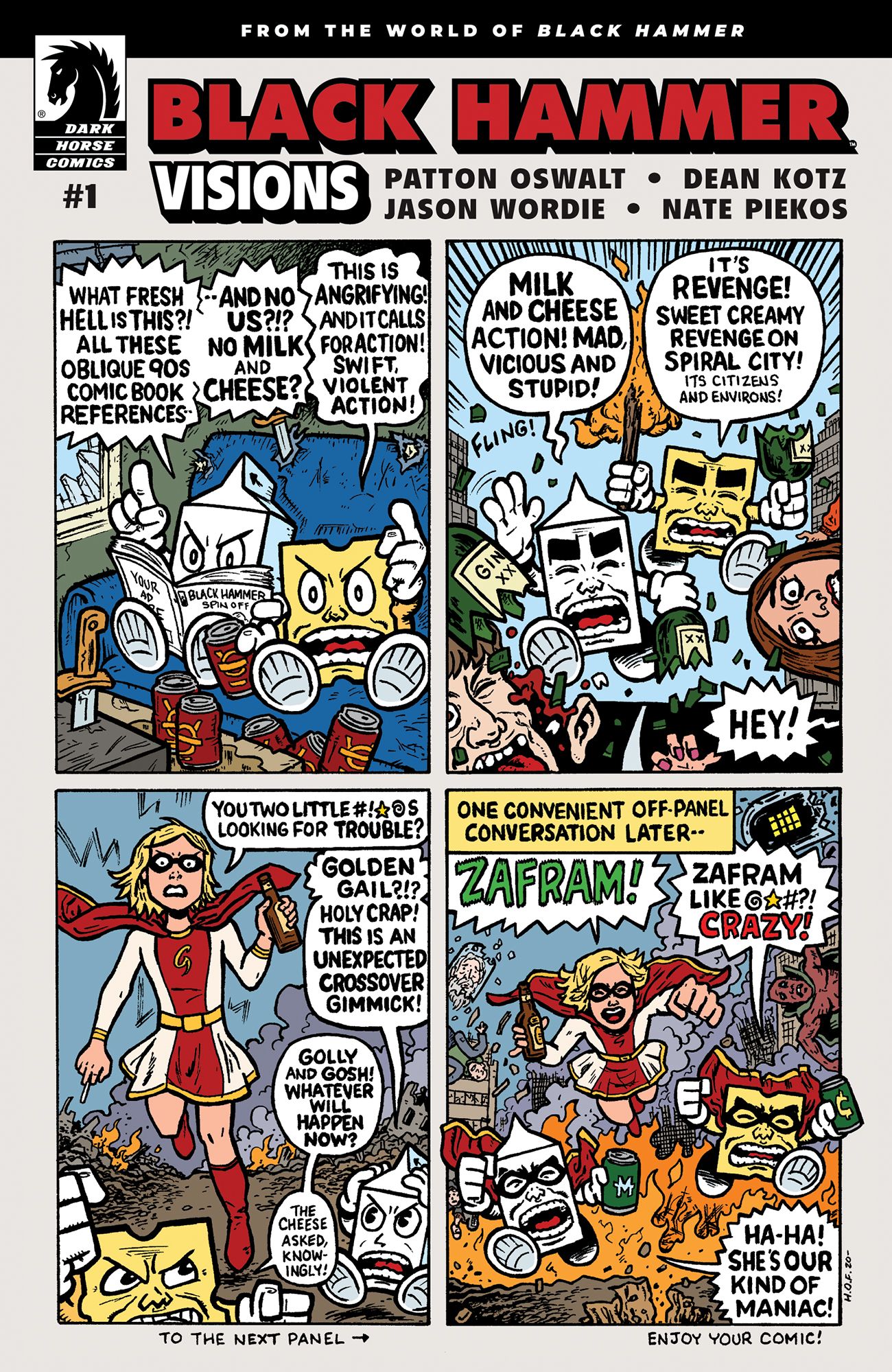 Kicking off Black Hammer: Visions, Patton Oswalt joins artists Dean Kotz and Jason Wordie to explore the life of youthful super heroine Golden Gail on the Black Hammer Farm before the beginning of Black Hammer#1, and her struggle to maintain sanity as a middle-aged woman trapped in the unchanging body of a superpowered grade-schooler. This 32-page issue also features variant covers by Evan Dorkin with Sarah Dyer, and Gilbert Hernandez with Dave Stewart!