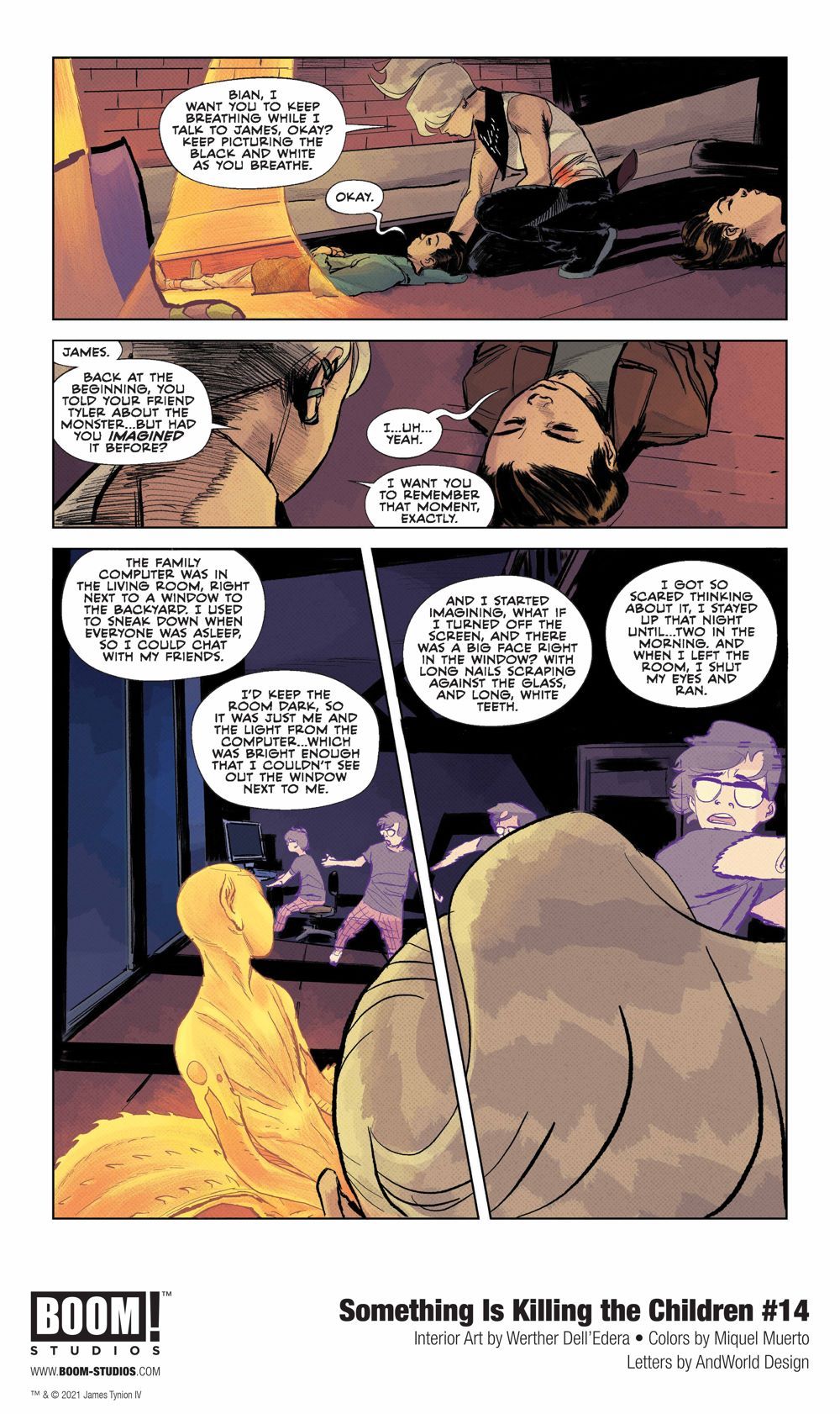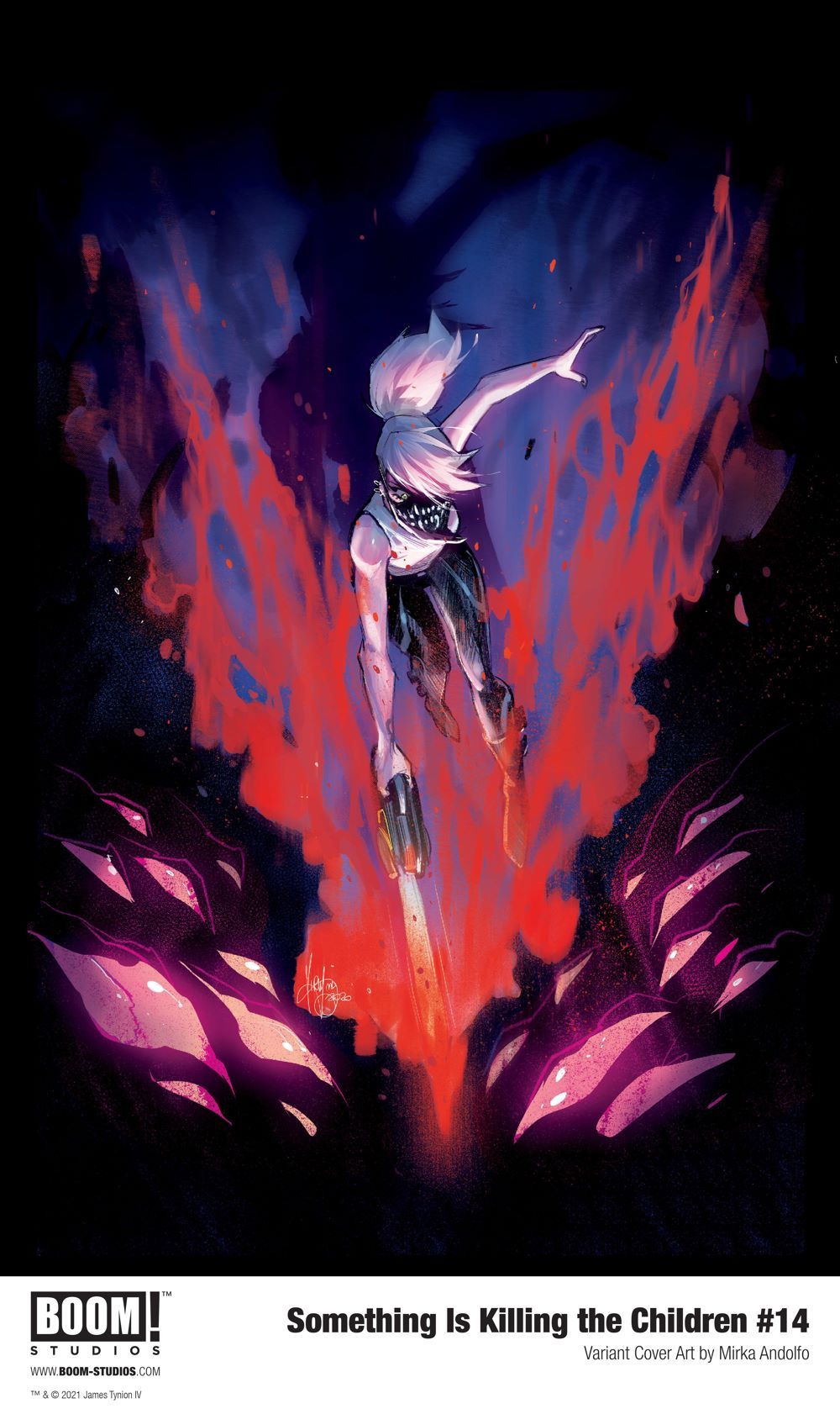 Print copies of SOMETHING IS KILLING THE CHILDREN #14 will be available for sale January 27, 2021 exclusively at local comic book shops (use comicshoplocator.com to find the nearest one) or at the BOOM! Studios webstore. Digital copies can be purchased from content providers, including comiXology, iBooks, Google Play, and Madefire.